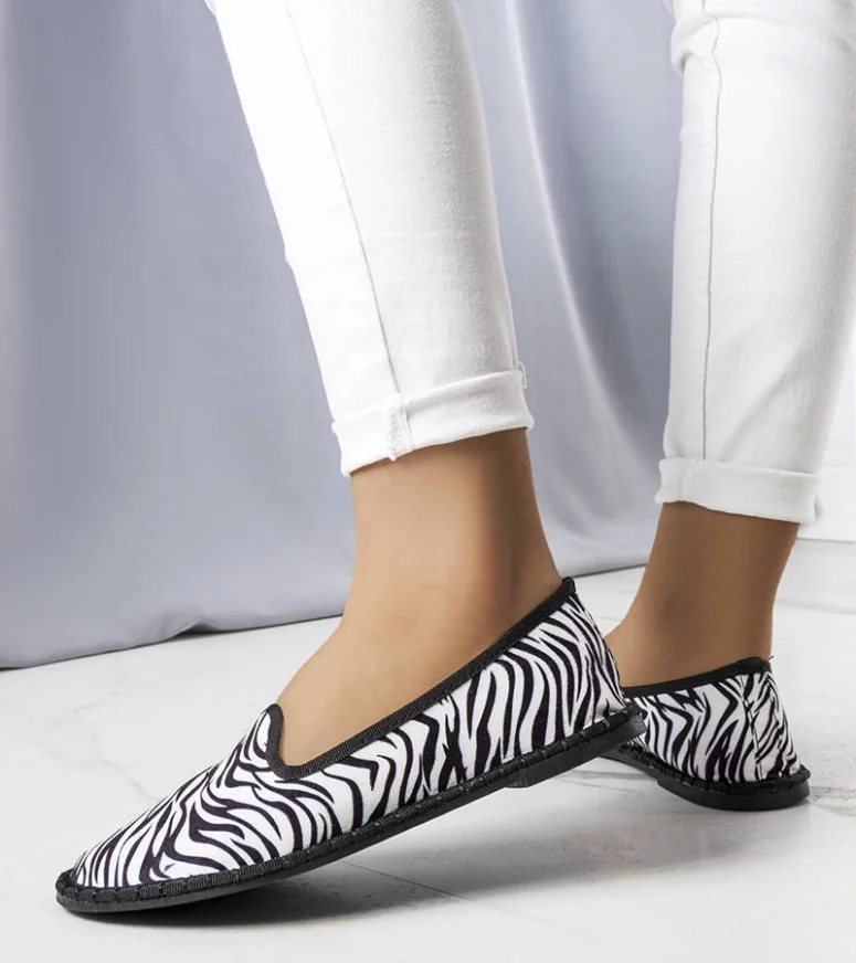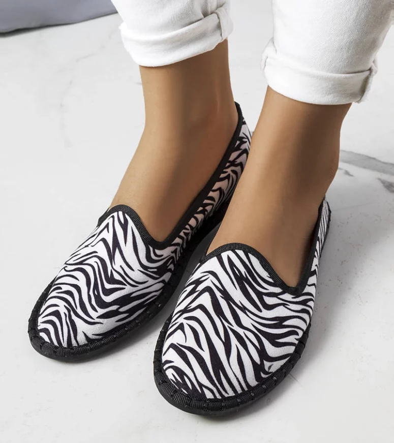 Balerinki Ermengardi wygodnie wsuwane, osadzone na płaskiej podeszwie. Niska cholewka, z okrągłym noskiem. Dekorowane printem zwierzęcym. Buty wykonane ze skóry ekologicznej zamszowej, wraz z wkładką. Numeracja zaniżona, sugerujemy wybrać o rozmiar większe.