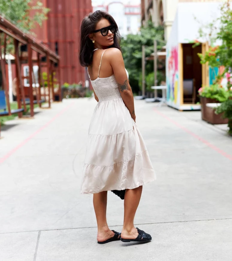 Beżowa sukienka Fiorentini to idealna propozycja dla kobiet ceniących sobie wygodę i elegancję w jednym. Rozkloszowany fason pięknie podkreśla kobiecą sylwetkę, a miękki materiał zapewnia komfort noszenia przez cały dzień. To również doskonały wybór dla tych, którzy szukają niedrogiej i taniej sukienki, która nie rezygnuje z wysokiej jakości wykonania i stylowego wyglądu. Ta damskie sukienka to świetny wybór na wiele okazji – od codziennych spotkań po bardziej uroczyste wydarzenia.