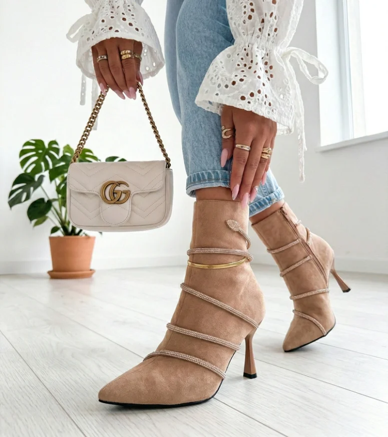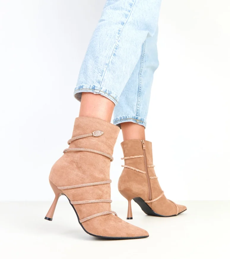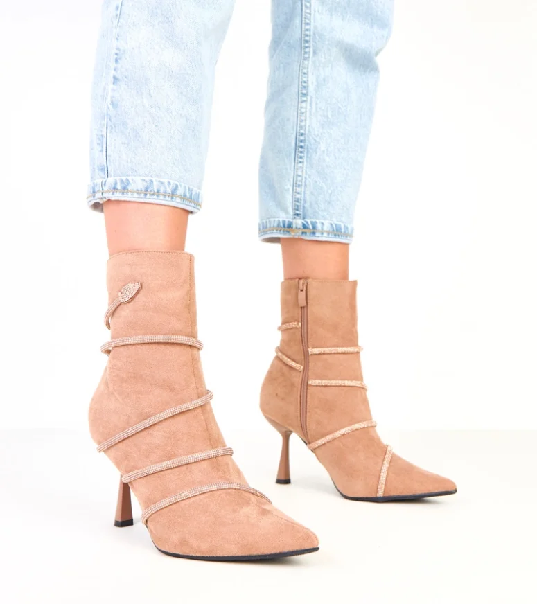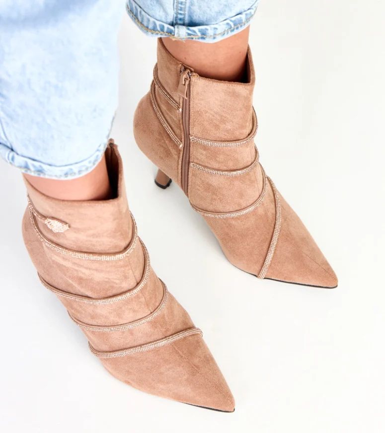 Beżowe botki na szpilce zdobione cyrkoniami Nethe – elegancja i blask na każdą okazję
