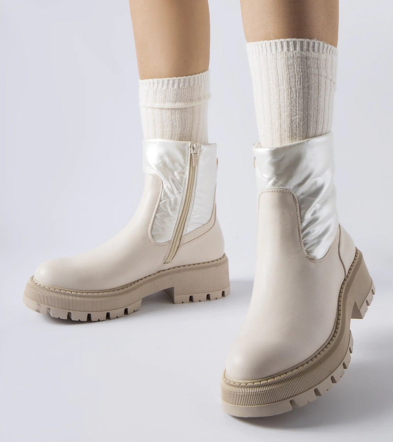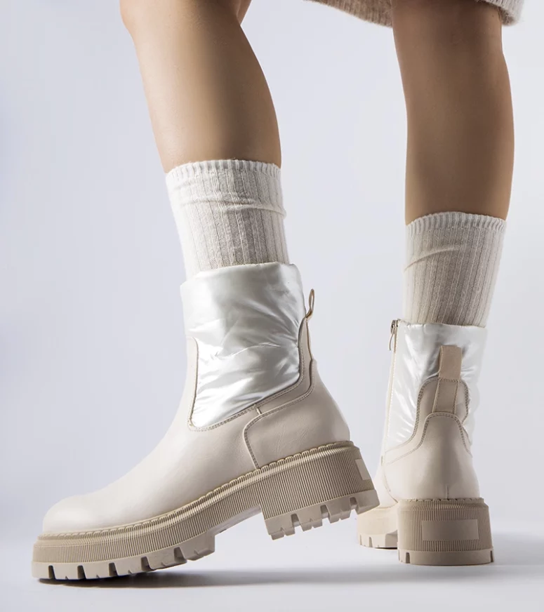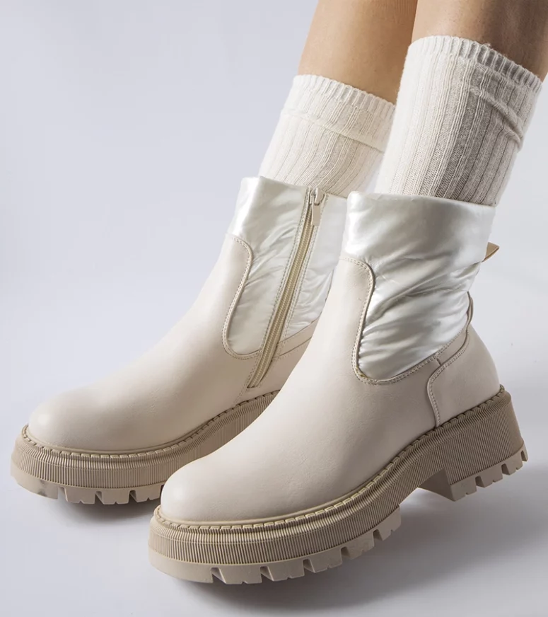 Beżowe botki z ozdobną cholewką Garrett są na czasie, mają zamek i płaski obcas. Mają również okrągły nosek, co dodaje im elegancji. Botki są wysokie za kostkę, co zapewnia ochronę przed zimnem. Wykonane są z gumy, co czyni je innowacyjnymi i trwałymi. Dodatkowo, są ciepłe, idealne na zimowe dni.