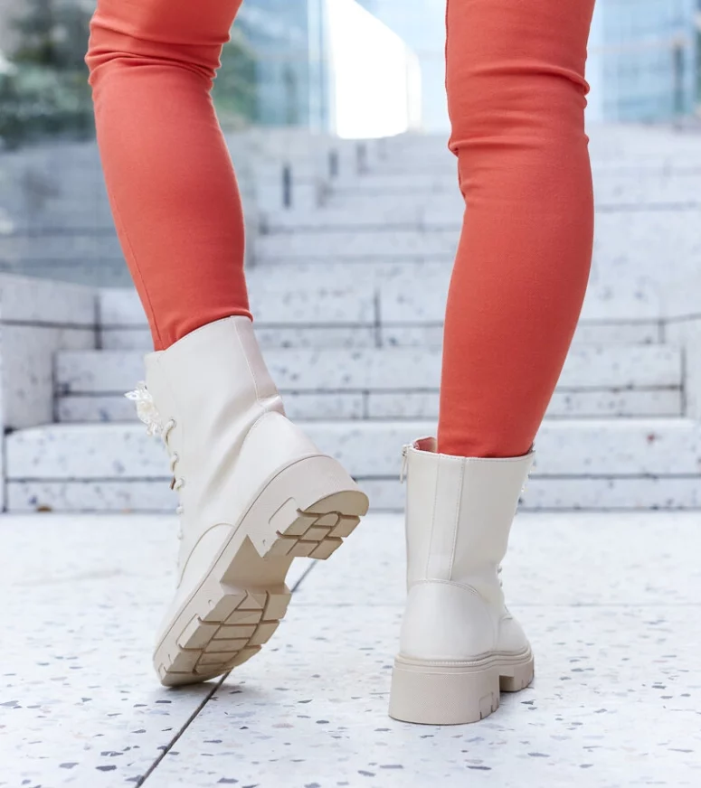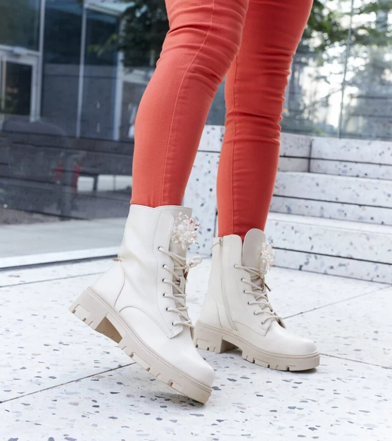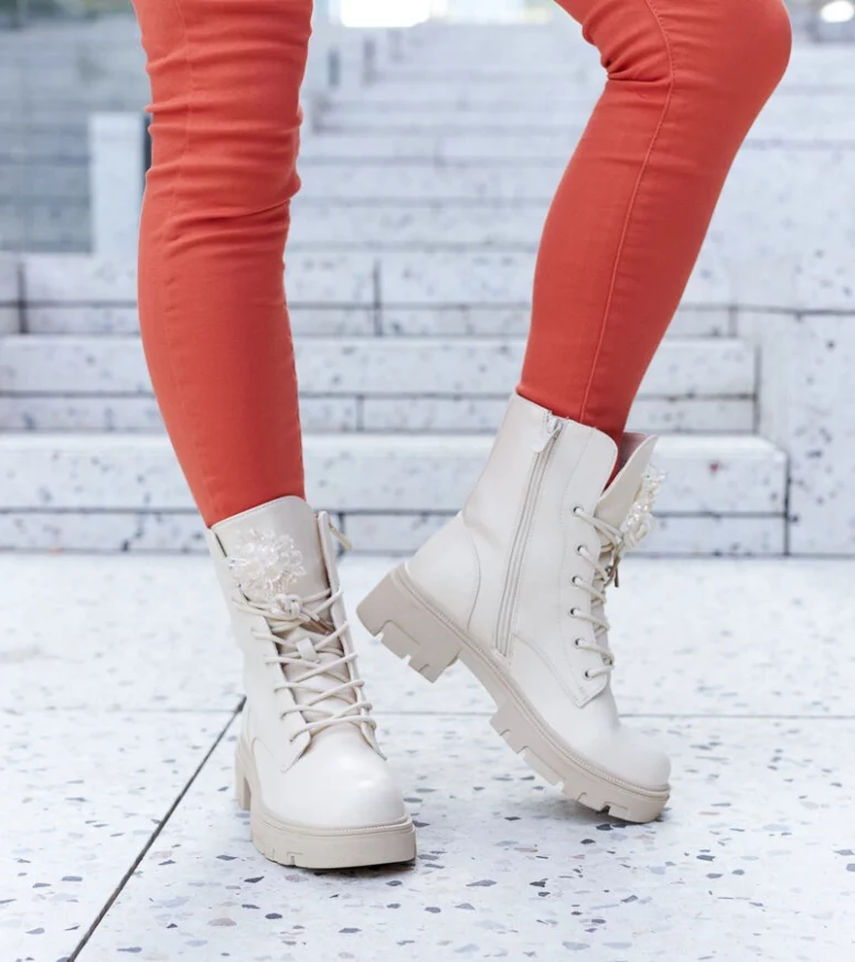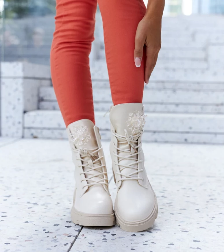 Botki te mają sztosową konstrukcję, która nadaje im nowoczesnego i modernistycznego wyglądu. Ozdobne koraliki umieszczone na butach dodają im elegancji i niepowtarzalnego charakteru. Ta para botków jest sznurowana, dzięki czemu można je dopasować do indywidualnych preferencji i rozmiaru stopy. Wysokie za kostkę podkreślają ich stylowy design i dodają pewności siebie każdemu outfitowi. Dodatkowo, botki te posiadają płaski obcas, co sprawia, że są stabilne i idealne do noszenia przez cały dzień. Dzięki temu można się cieszyć zarówno modnym wyglądem, jak i wygodą podczas długich spacerów czy codziennych obowiązków. Beżowe botki z ozdobnymi koralikami Accadia to doskonały wybór dla wszystkich, którzy szukają stylowych, ciepłych i komfortowych butów na zimę. Ich nowoczesny design oraz wysoka jakość wykonania sprawiają, że będą one idealnym dopełnieniem każdej zimowej garderoby.