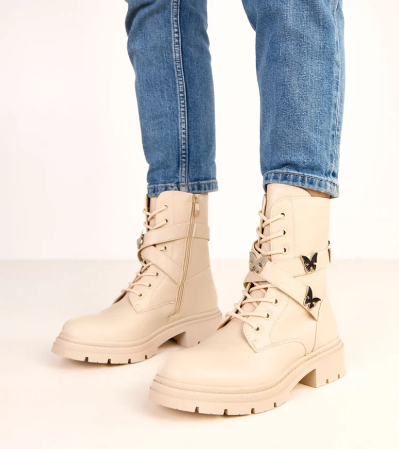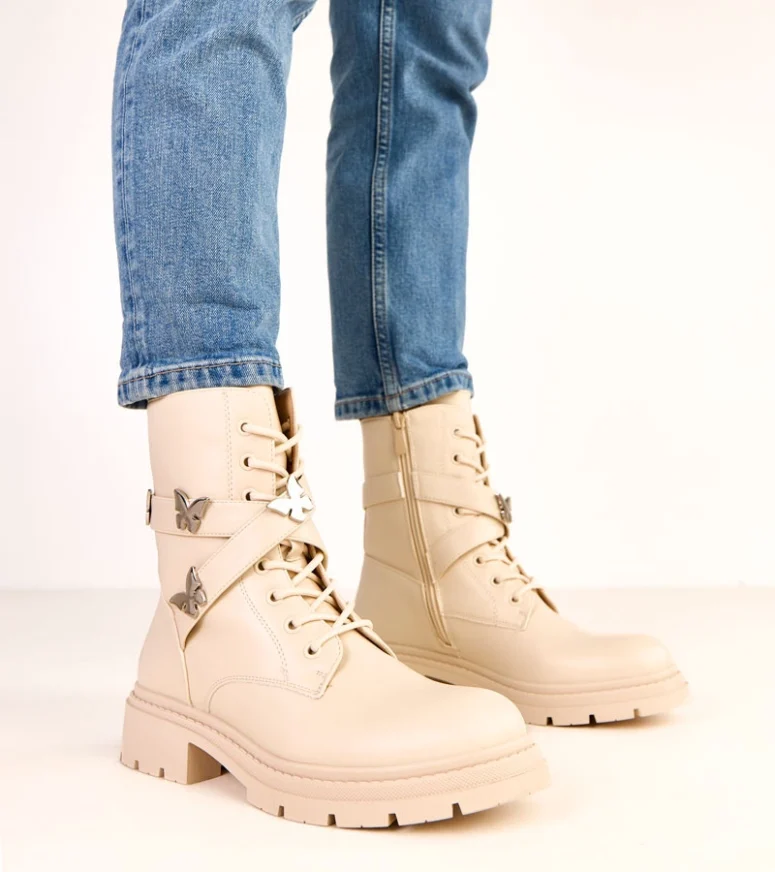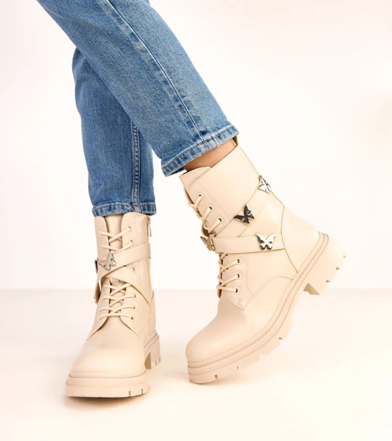 Odkryj niezwykle kobiece beżowe botki zdobione motylkami Justia, które łączą w sobie subtelną elegancję i dziewczęcy urok. To idealne botki damskie dla kobiet ceniących oryginalne detale i wygodę na co dzień. Delikatny, uniwersalny kolor beżu sprawia, że botki Justia doskonale dopasują się do większości stylizacji – od casualowych po bardziej eleganckie. Wyjątkowe zdobienia w postaci motylków dodają im lekkości i niepowtarzalnego charakteru, dzięki czemu wyróżnisz się w tłumie.