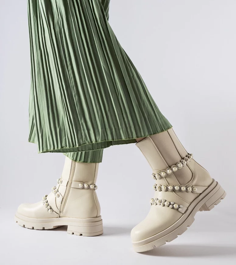 Beżowe botki zdobione perełkami Callicratide to nowoczesne i współczesne obuwie, idealne dla młodego pokolenia. Mają okrągły nosek i są zapinane na zamek, co sprawia, że są łatwe do założenia i zdejmowania. Wykonane z tworzywa sztucznego, te botki są doskonałą opcją na zimę, ponieważ są ciepłe i wysokie za kostkę, chroniąc stopy przed chłodem. Mają płaski obcas, co czyni je wygodnymi do codziennego użytku. Te damskie botki będą doskonałym dodatkiem do różnorodnych stylizacji, dodając im elegancji i subtelności dzięki delikatnie zdobionym perełkami.