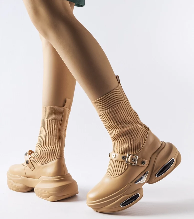 Niezwykle modny design tych botków jest doskonały na każdą okazję. Beżowy kolor pasuje do wielu stylizacji, a skarpetkowa cholewka dodaje im unikalnego uroku. Dodatkowo, ich okrągły nosek zapewnia komfort podczas noszenia oraz dodaje elegancji. Botki Ivana to nie tylko świetnie wyglądający buty, ale również praktyczne rozwiązanie. Damski krój gwarantuje idealne dopasowanie do kobiecej stopy, zapewniając maksymalny komfort przez cały dzień. Bez względu na to, czy idziesz do pracy, na spotkanie z przyjaciółmi czy na wieczorny spacer, te botki będą Twoim niezawodnym partnerem. Podsumowując, beżowe botki ze skarpetkową cholewką Ivana to modne, nowoczesne i wygodne obuwie. Ich wysoki krój, gumowa konstrukcja, wsuwane wykonanie oraz damski krój sprawiają, że są one nie tylko stylowe, ale również funkcjonalne. Dodatkowo, okrągły nosek nadaje im elegancji i zapewnia wygodę noszenia. Niezależnie od okazji, te botki są doskonałym wyborem dla każdej kobiety.