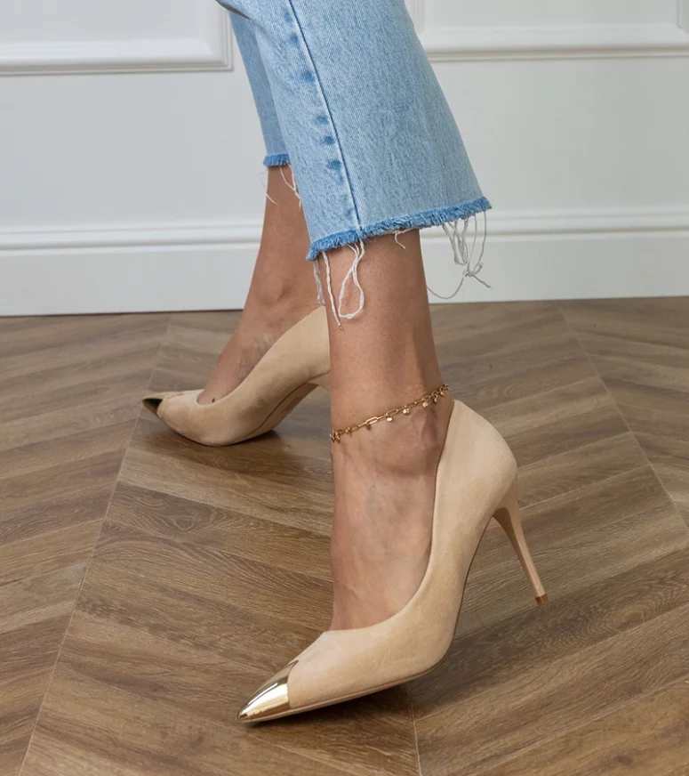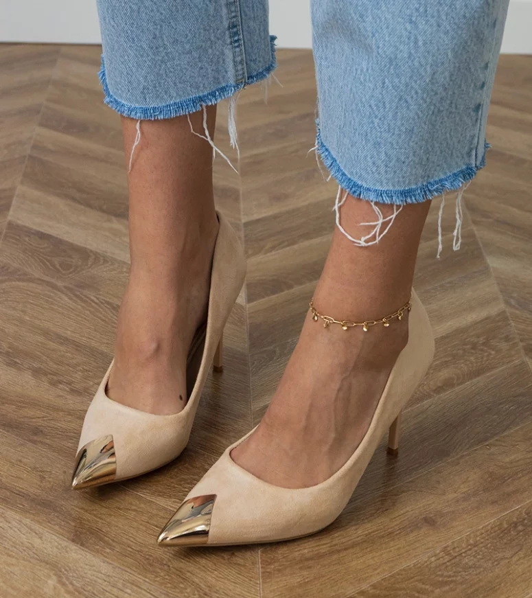 Charakterystycznym elementem modelu jest metaliczny nosek, który dodaje butom nowoczesnego i wyrazistego charakteru. Ten subtelny akcent przyciąga uwagę, podkreśla styl właścicielki i sprawia, że beżowe czółenka doskonale sprawdzą się zarówno w biurze, jak i na wieczornym wyjściu. Połączenie miękkiego ekozamszu z połyskującym przodem tworzy modny kontrast, który ożywi nawet najprostszą stylizację.