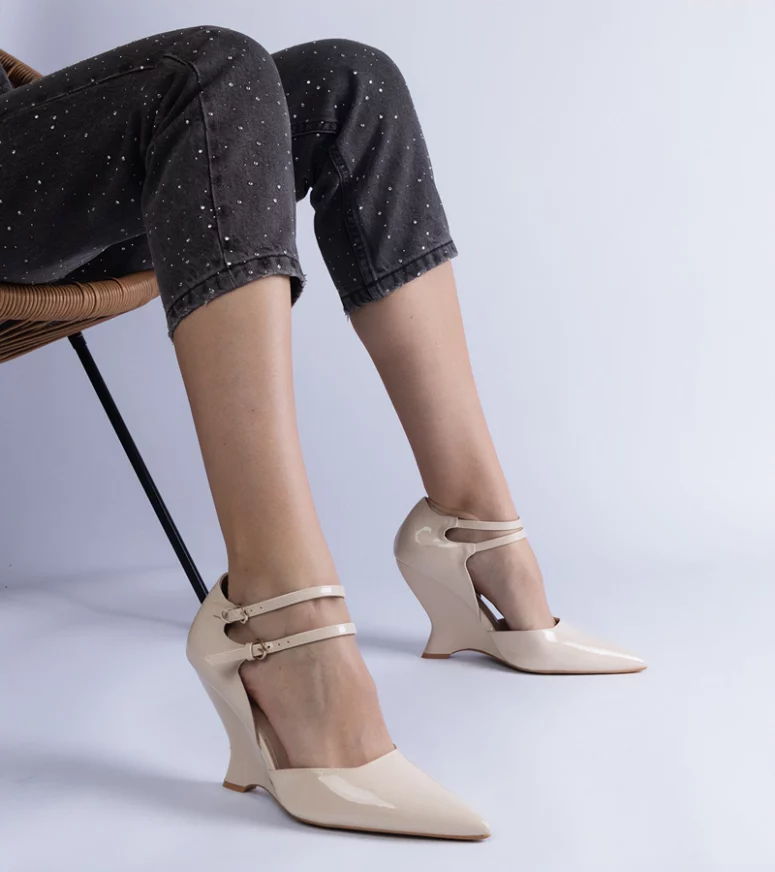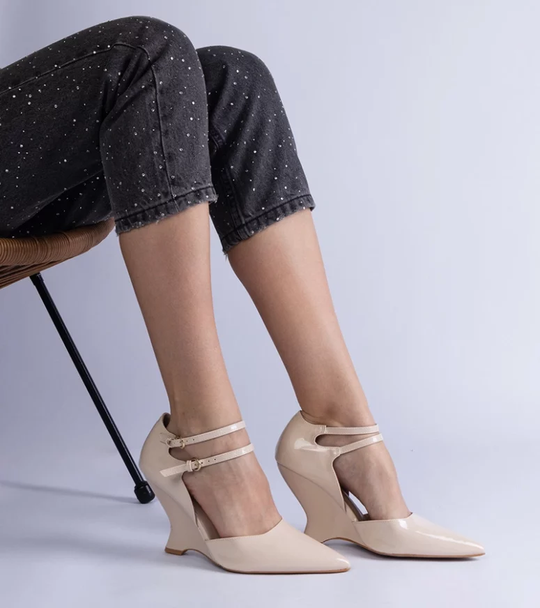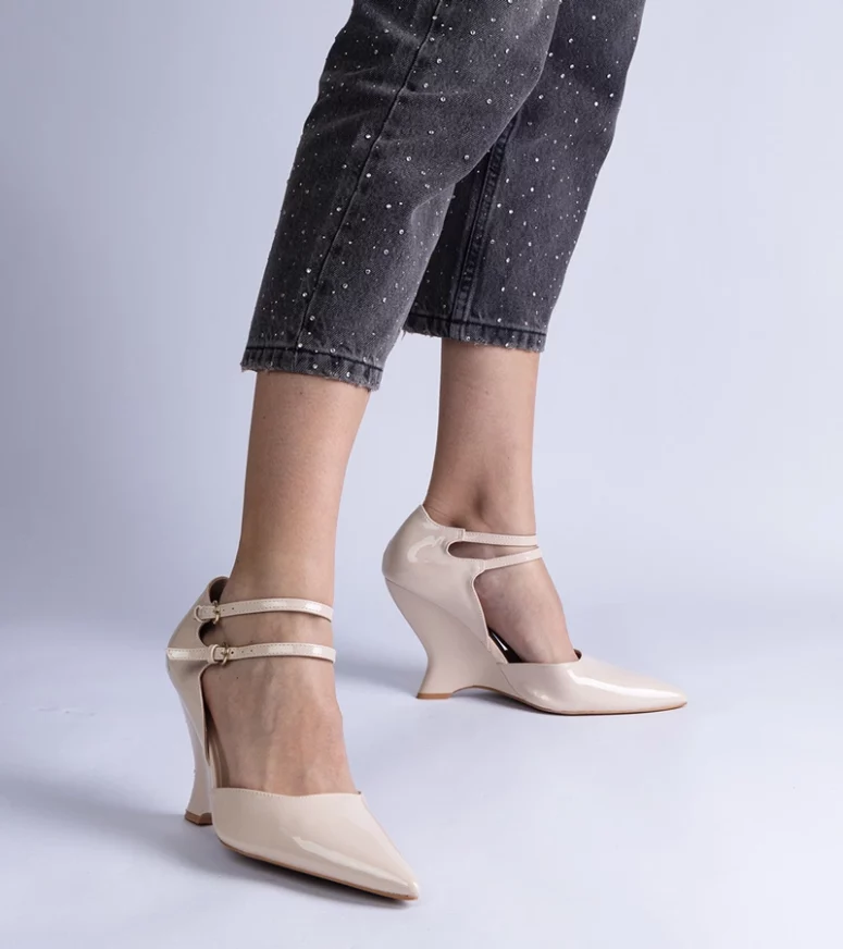 Te lakierowane czółenka wyróżniają się nie tylko pięknym beżowym kolorem, ale także subtelnymi sprzączkami, które dodają im wyjątkowego charakteru. Koturn o optymalnej wysokości sprawia, że są idealne zarówno na formalne okazje, jak i codzienne wyjścia. Dzięki stabilnej konstrukcji, chodzenie w nich to czysta przyjemność, a jednocześnie dodają kilka centymetrów wzrostu, co podkreśla sylwetkę.