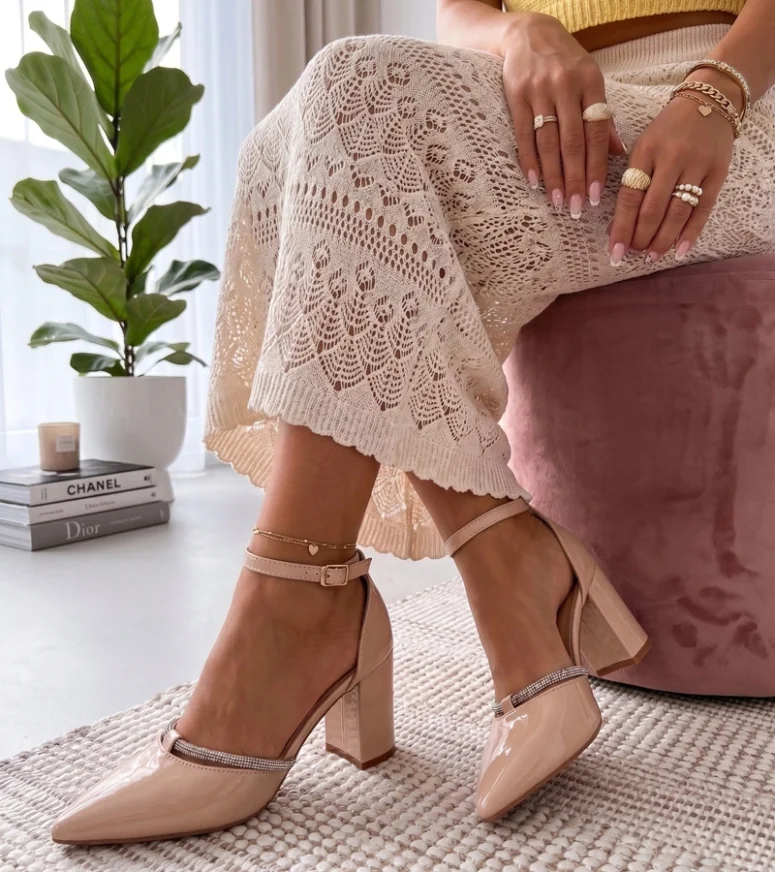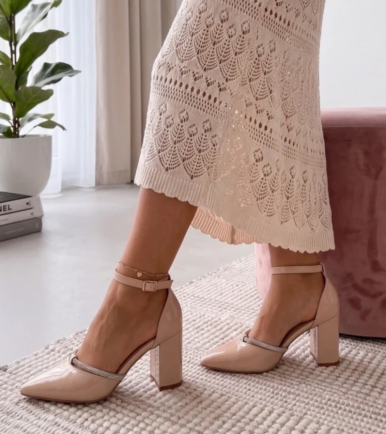 Beżowe Czółenka Lakierowane Zdobione Cyrkoniami Victoria