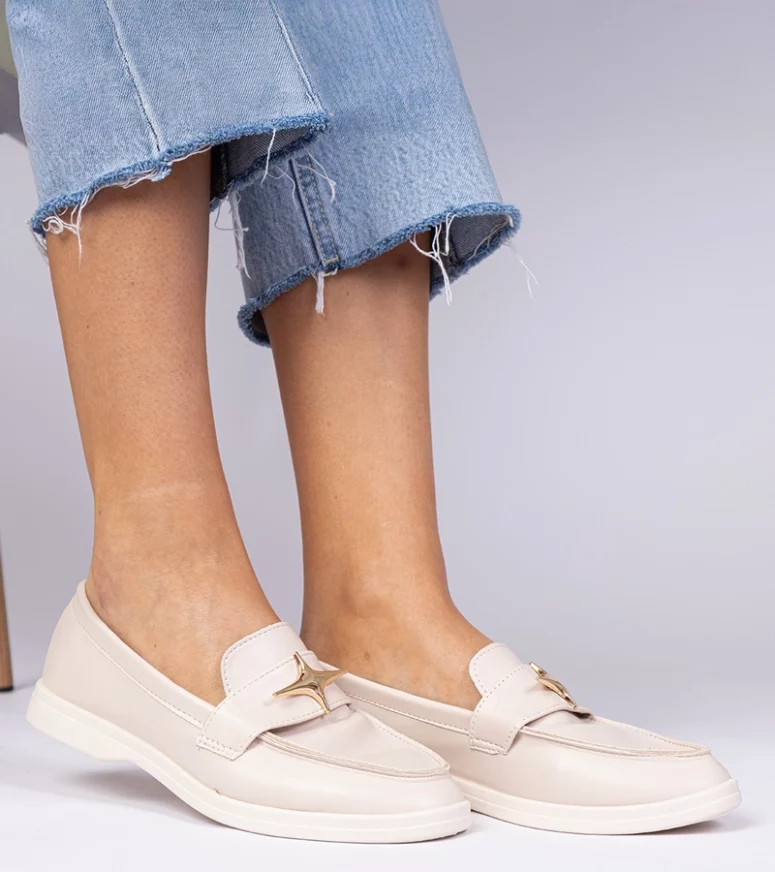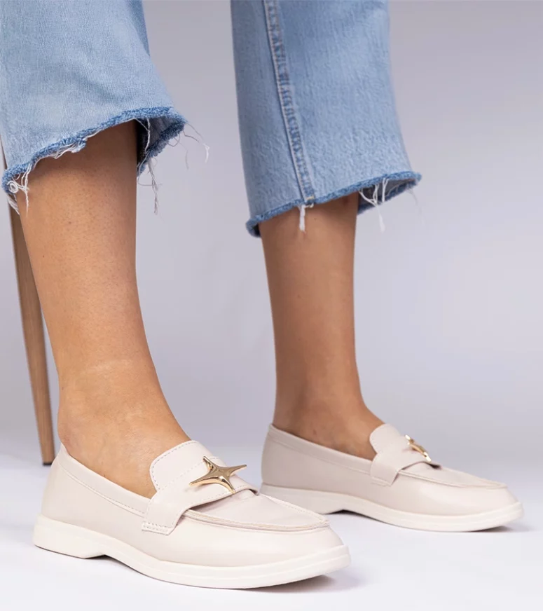 Beżowe damskie mokasyny ze złotą ozdobą Senna