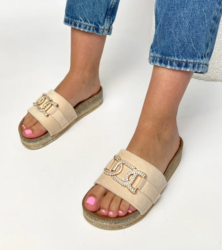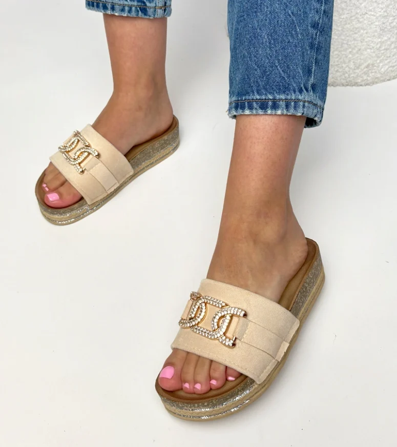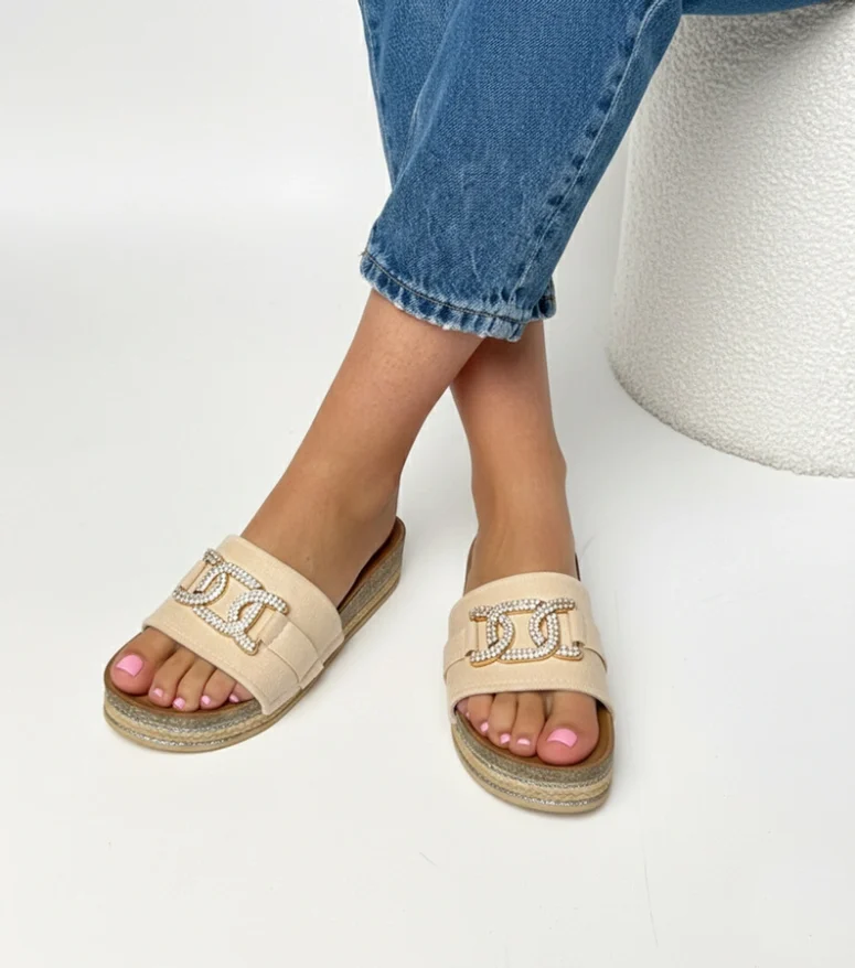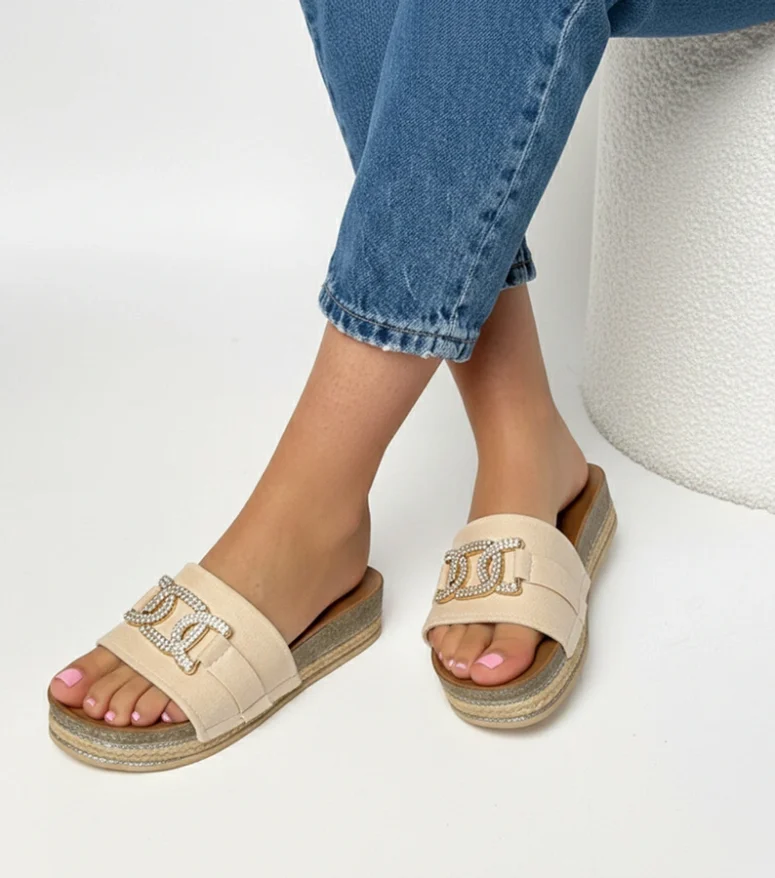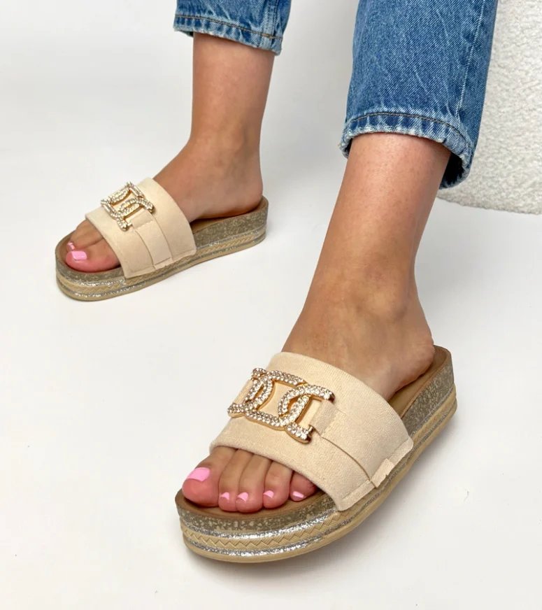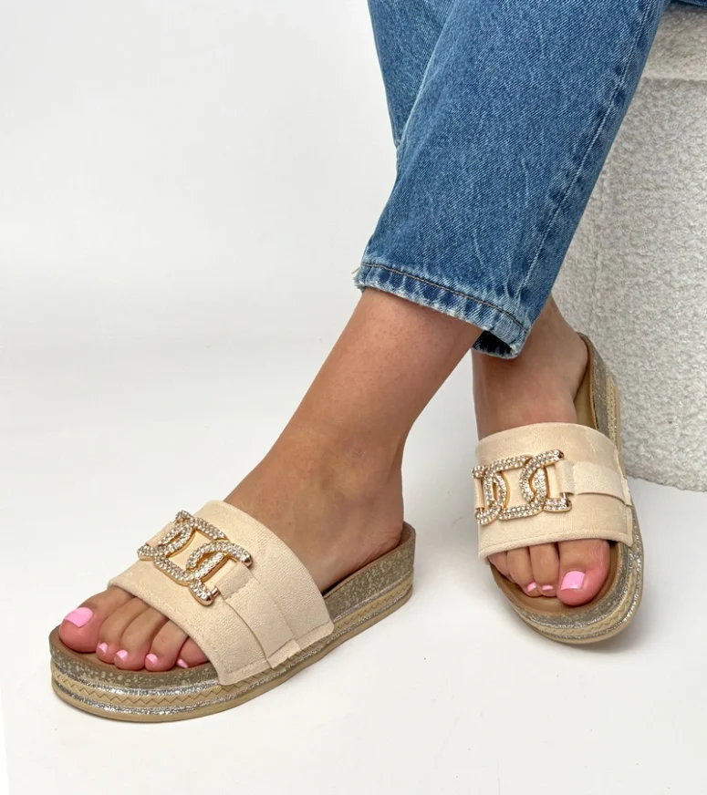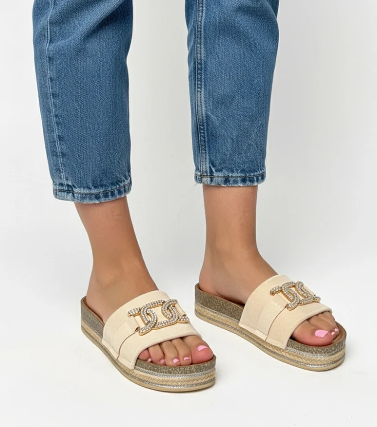 Beżowe klapki na platformie z błyszczącymi ozdobami Faustine