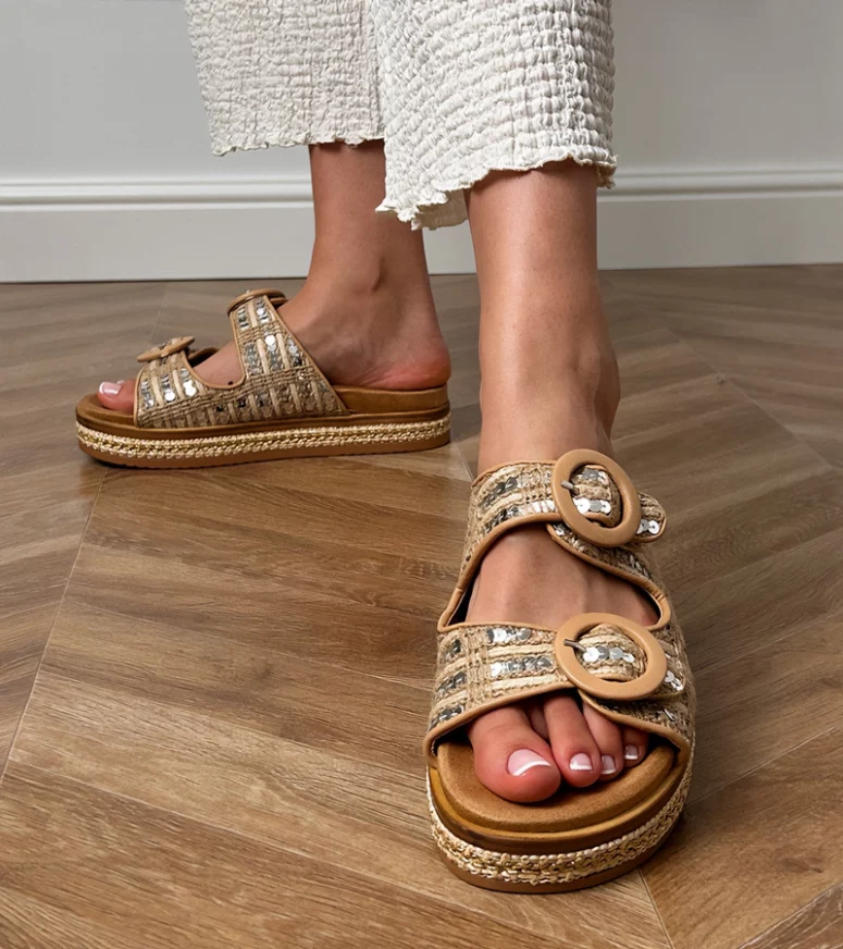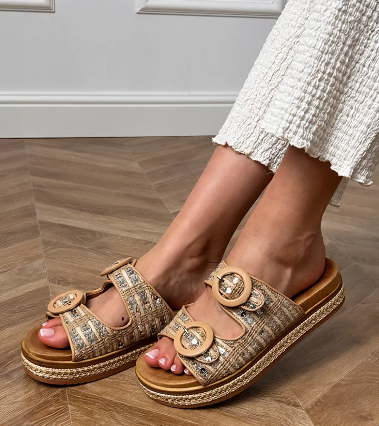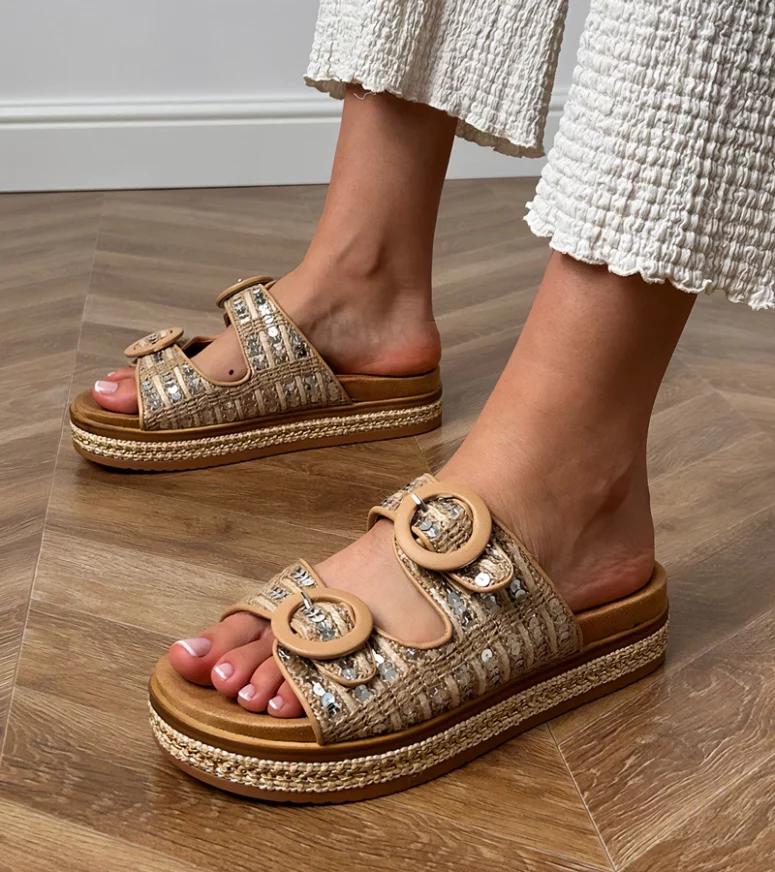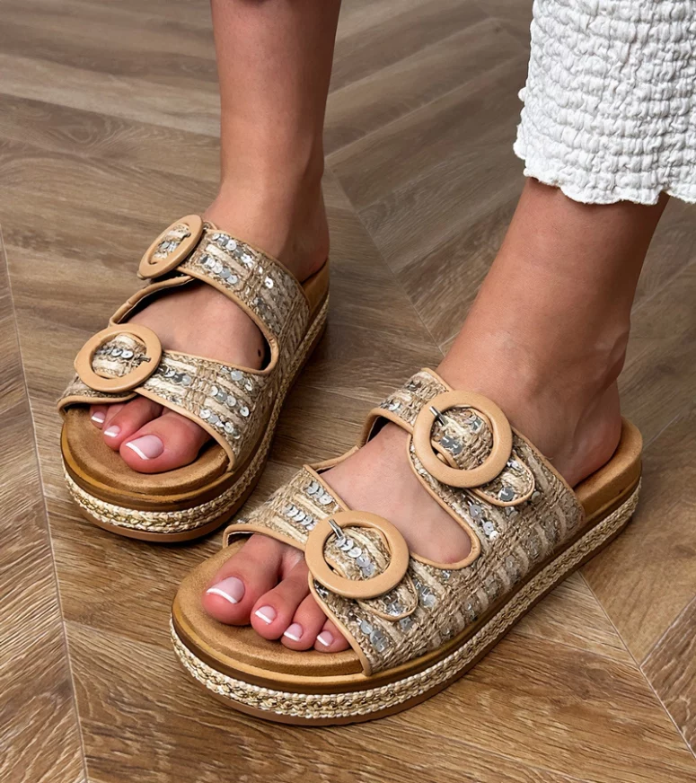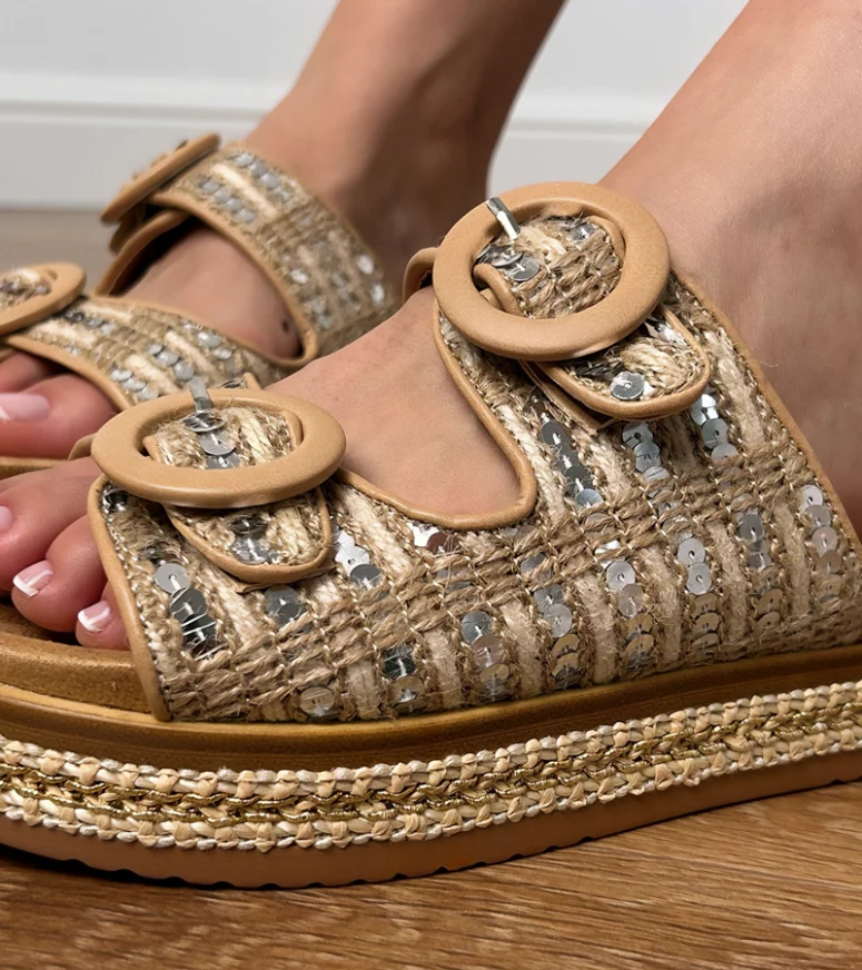 Te klapki plecione zostały zaprojektowane z myślą o kobietach, które chcą dodać swojemu codziennemu wyglądowi odrobinę blasku. Dzięki delikatnym cekinom, umieszczonym na paskach, Twoje stopy będą przyciągać spojrzenia, a Ty poczujesz się wyjątkowo, niezależnie od okazji. Beżowy kolor doskonale komponuje się z różnymi stylizacjami, co czyni te klapki uniwersalnym dodatkiem do każdej garderoby.