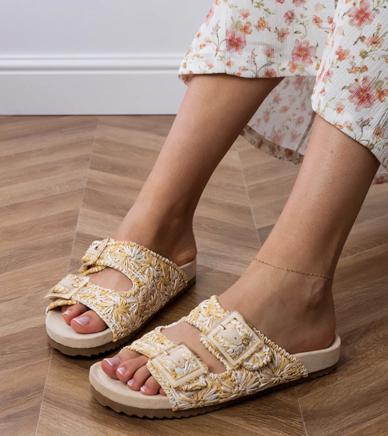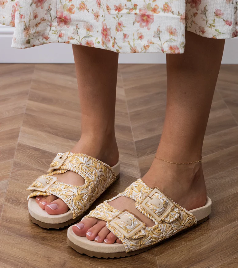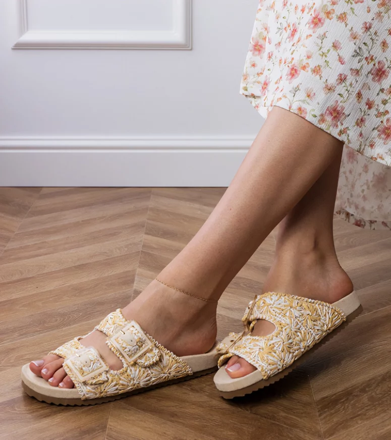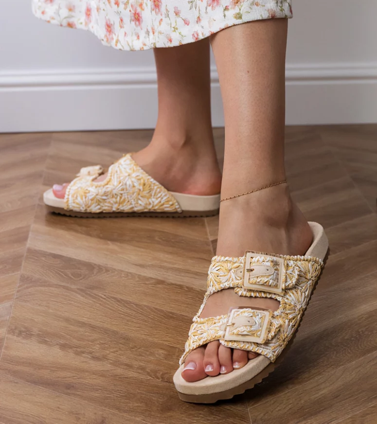 Beżowe klapki szydełkowe z klamrami na paskach Firada to propozycja dla kobiet, które poszukują oryginalnych dodatków do swojej garderoby. Neutralny beż idealnie komponuje się z jasnymi i pastelowymi barwami, ale równie dobrze wygląda w zestawieniu z intensywnymi kolorami. Dzięki temu z łatwością włączysz je do swoich codziennych stylizacji. Sprawdzą się na spacer, zakupy, do pracy w mniej formalnym biurze, a także na wakacyjne wyjścia na plażę czy deptak.
