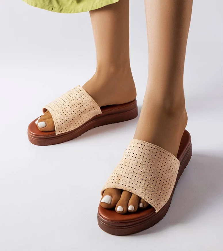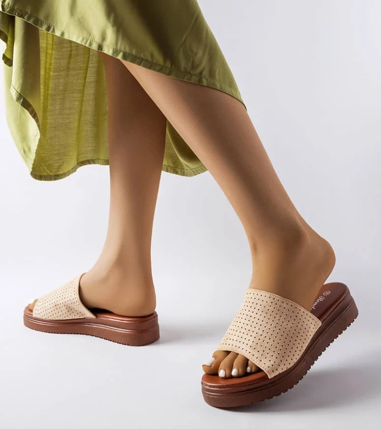 Beżowe klapki z ażurową cholewką Idabel to idealny wybór dla wszystkich, którzy cenią sobie nowoczesny design oraz wygodę użytkowania. Te modernistyczne klapki są wykonane z trwałego tworzywa sztucznego, co gwarantuje ich niską cenę oraz długą żywotność. Ażurowa cholewka zapewni Ci przewiewność i komfort na gorące letnie dni, a platforma podniesie Twój styl na wyższy poziom. Klapki te są dedykowane dla pań, które pragną być modne bez rezygnacji z wygody. Wybierz Beżowe klapki z ażurową cholewką Idabel i ciesz się wakacjami jak nigdy wcześniej!