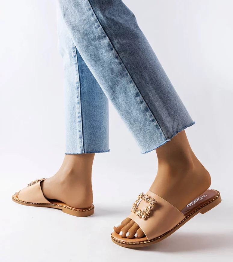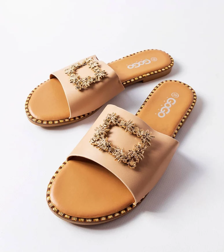 Te damskie klapki doskonale sprawdzą się na gorące dni, gdy potrzebujesz lekkiego i przewiewnego obuwia. Ich beżowy kolor harmonijnie wpisuje się w letnie krajobrazy, a metaliczna ozdoba dodaje im elegancji. Dzięki nim będziesz czuła się wyjątkowo i modnie, a jednocześnie będziesz mogła cieszyć się pełną swobodą ruchów. Wybierz je już dziś i poczuj letnią bryzę na swoich stopach!