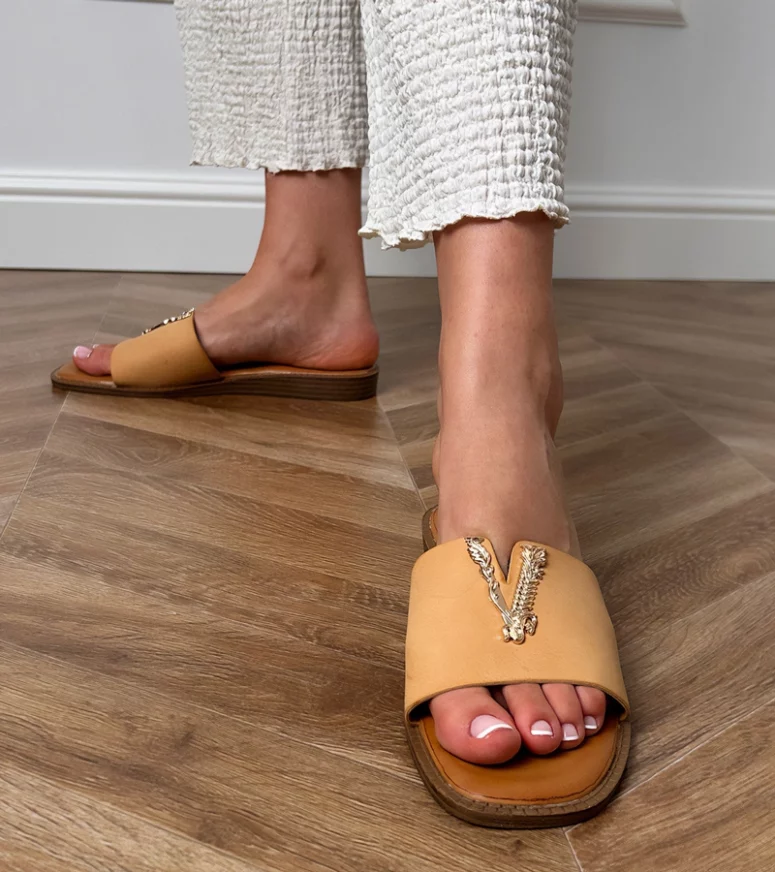 beżowe klapki, beżowe klapki ze złotą ozdobą, Beżowe klapki ze złotą ozdobą Flavis, klapki damskie, klapki damskie beżowe, klapki na lato, klapki na co dzień, klapki Flavis, klapki z ozdobą, klapki eleganckie, klapki damskie na lato, marka niezdefiniowana, Klapki