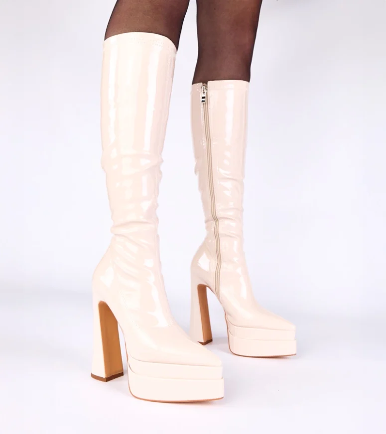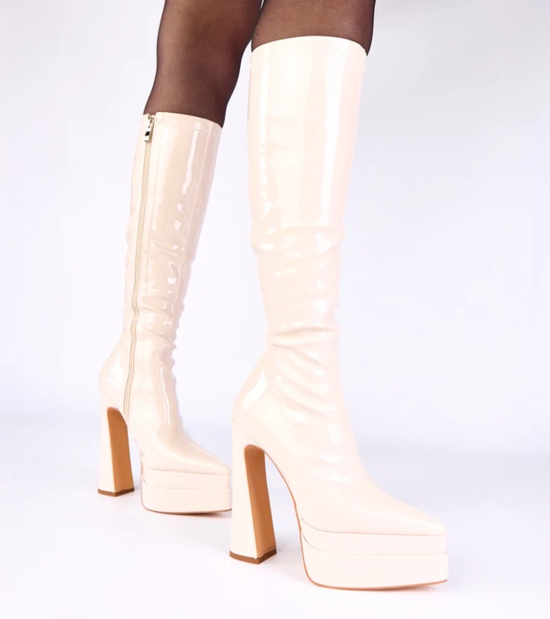 Beżowe kozaki na słupku lakierowane z platformą Jemina – elegancja i wygoda