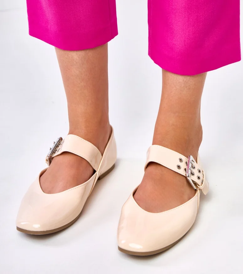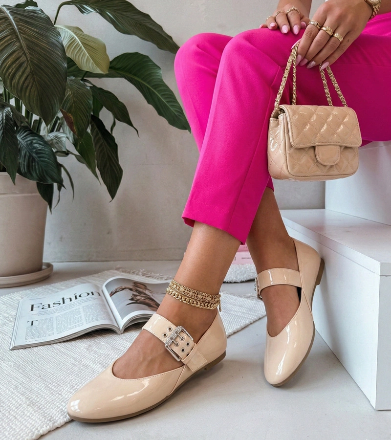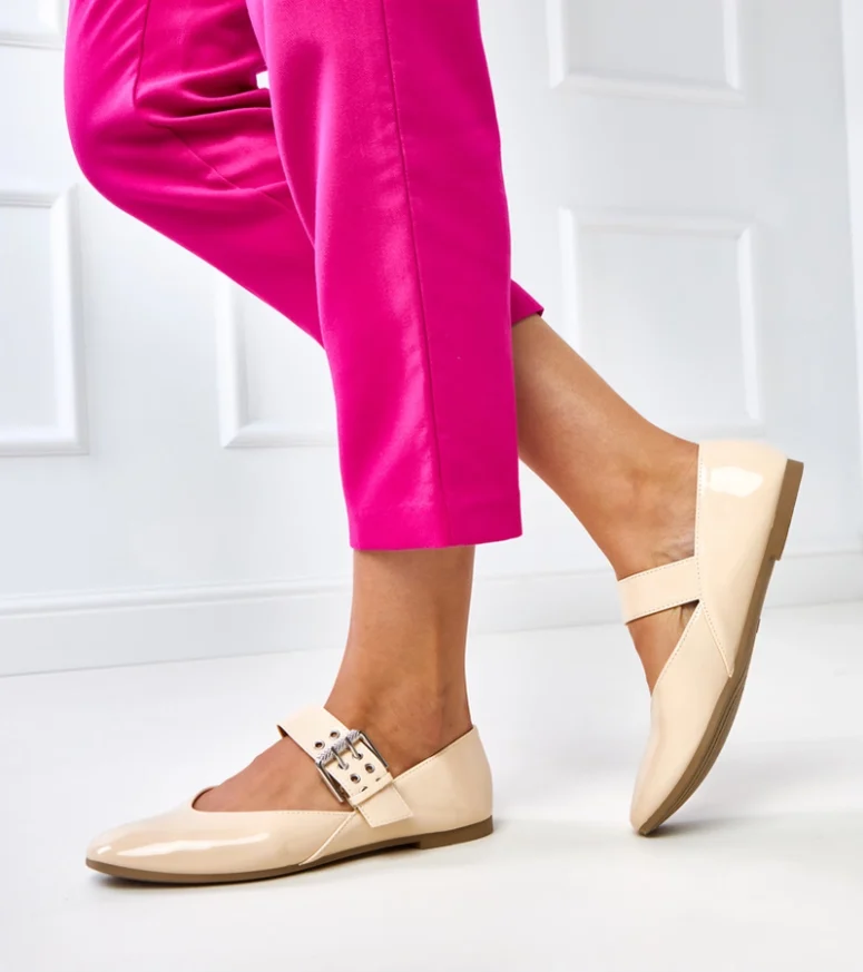 Dzięki uniwersalnemu kolorowi beżowe lakierowane balerinki z ozdobną klamerką Damia doskonale komponują się z sukienkami, spódnicami, spodniami materiałowymi oraz jeansami. Możesz je założyć do biura, na ważne wyjście lub jako wygodne obuwie na co dzień, zawsze zachowując elegancki wygląd. Balerinki te stanowią świetną alternatywę dla wysokich obcasów, gwarantując swobodę ruchów i maksymalny komfort bez rezygnacji z kobiecego charakteru stylizacji.