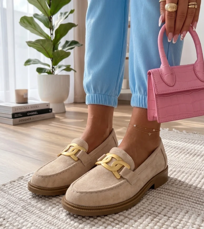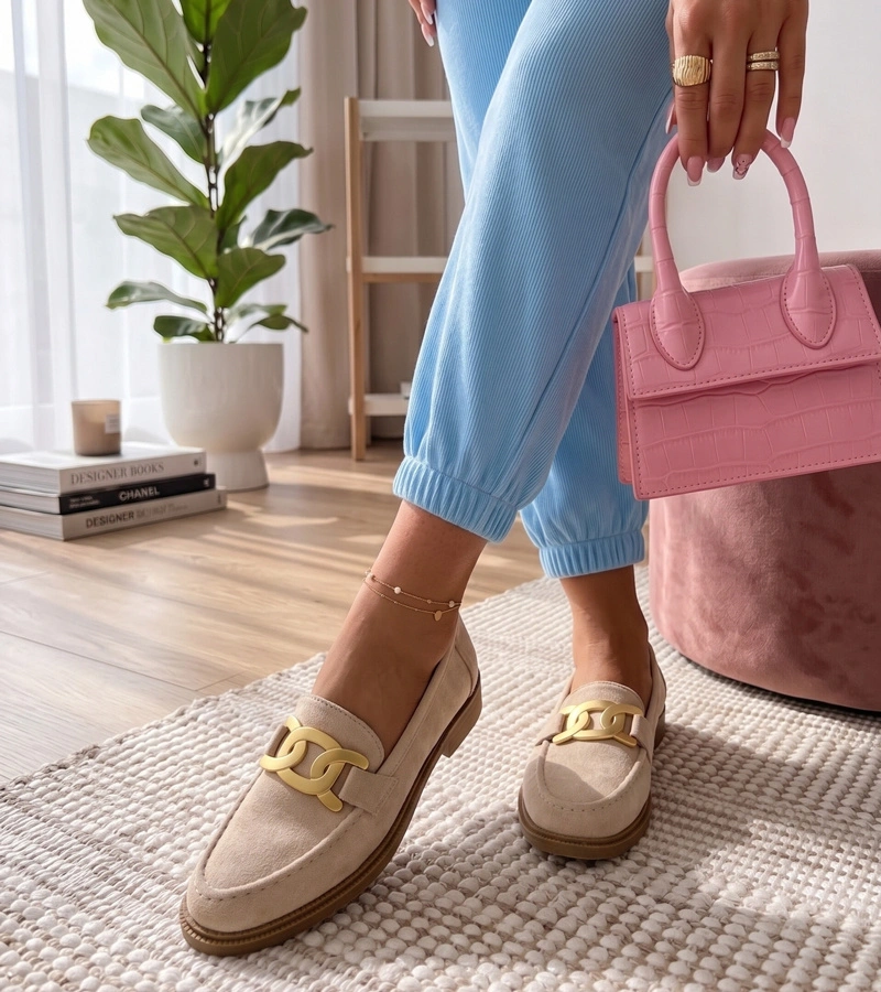 Beżowe Mokasyny Z Ozdobną Klamerką Leopoldyna