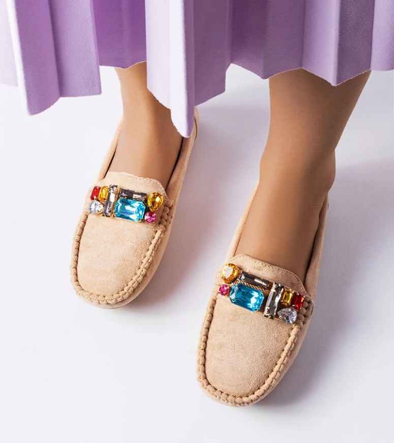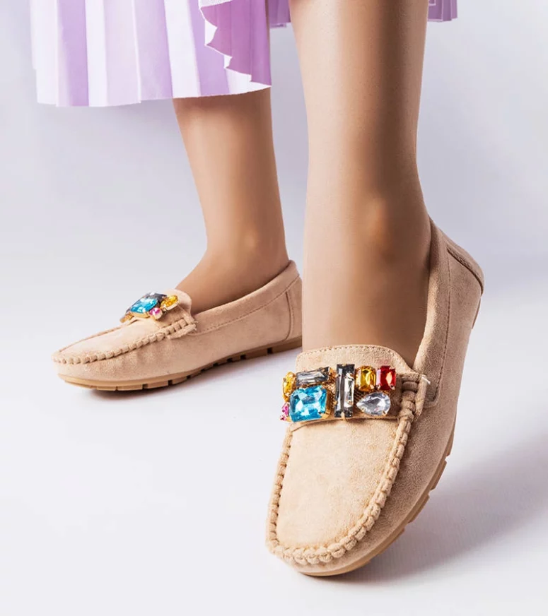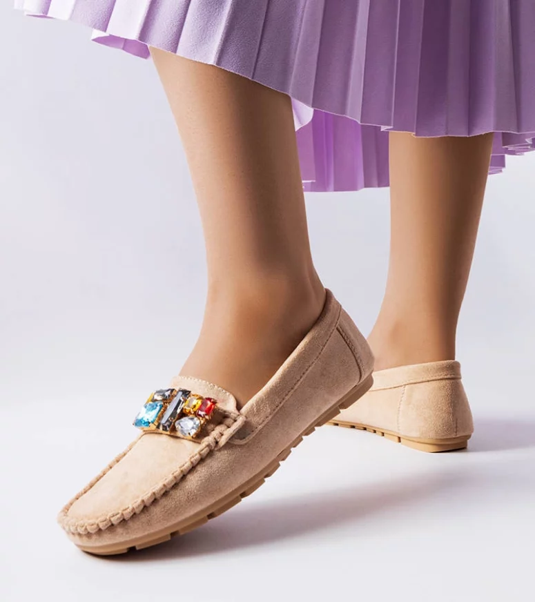 Mokasyny Bertrand na grubej, płaskiej podeszwie. Wsuwane, z noskiem o zaokrąglonej krawędzi. Dekorowane z przodu charakterystycznym, grubym przeszyciem w dopasowanym kolorze. Z przodu ozdobione dodatkowo kolorowymi cyrkoniami. Wykonane ze skóry ekologicznej zamszowej. Wyścielone skóra naturalną, z wbudowaną miękką pianką. Uniwersalny kolor sprawia, że mokasyny będą pasowały do ubrań w każdym stylu i kolorze. Będą dobrze leżeć na wąskiej stopie. Numeracja zaniżona, sugerujemy wybrać o rozmiar większe.