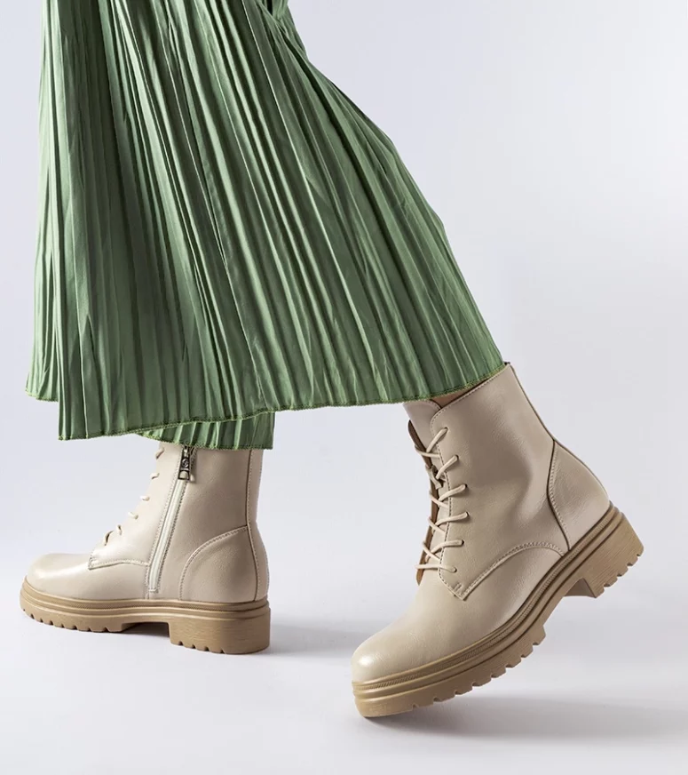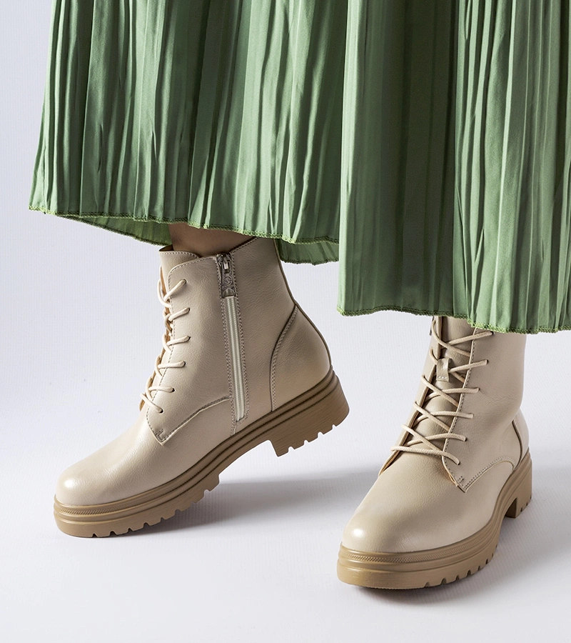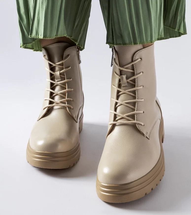 Beżowe ocieplane traperki Vinceza to rewolucyjne i trendy obuwie na zamek. Wykonane z wysokiej jakości tworzywa sztucznego, te nowoczesne traperki są doskonałe na zimowe dni. Mają okrągły nosek i płaski obcas, co sprawia, że są wygodne do noszenia przez cały dzień. Sznurowane zapinanie gwarantuje idealne dopasowanie do stopy. Dodatkowo, dzięki ociepleniu, są one ciepłe nawet w najzimniejsze dni. Te damskie traperki sięgające powyżej kostki dodadzą modnego akcentu do każdej zimowej stylizacji.