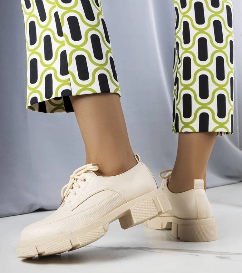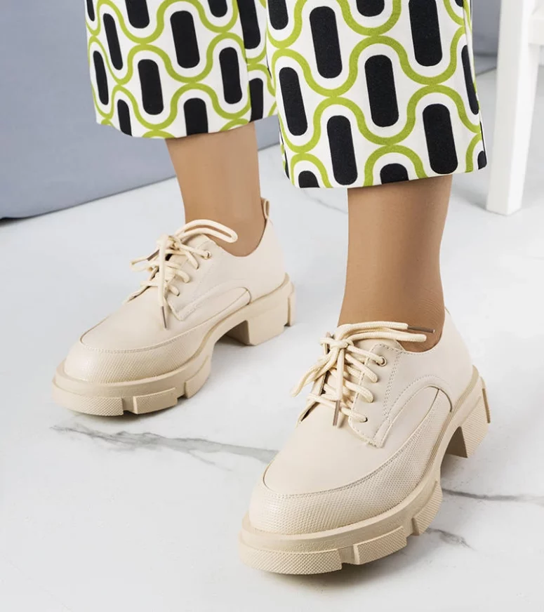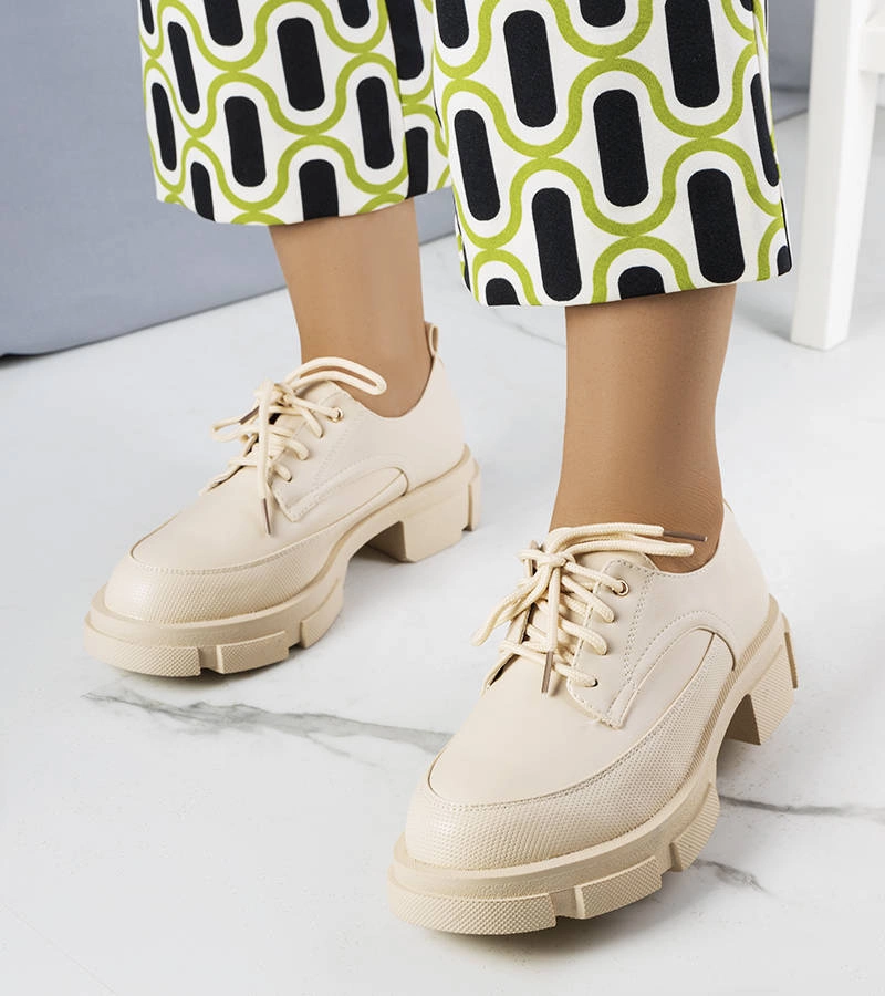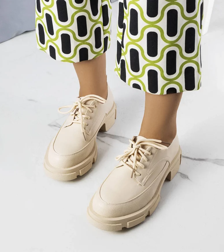 Półbuty Kay na modnej, traktorowej podeszwie z kwadratowym obcasem. Niska cholewka przed kostkę. Z przodu krótkie sznurowanie. Okrągły nosek i minimalistyczne przeszycia. Wykonane ze skóry ekologicznej razem z wkładką. Noś do bluzki z dekoracyjnymi łańcuszkami i skórzanej spódnicy. Numeracja standardowa, prosimy kierować się swoim rozmiarem.
