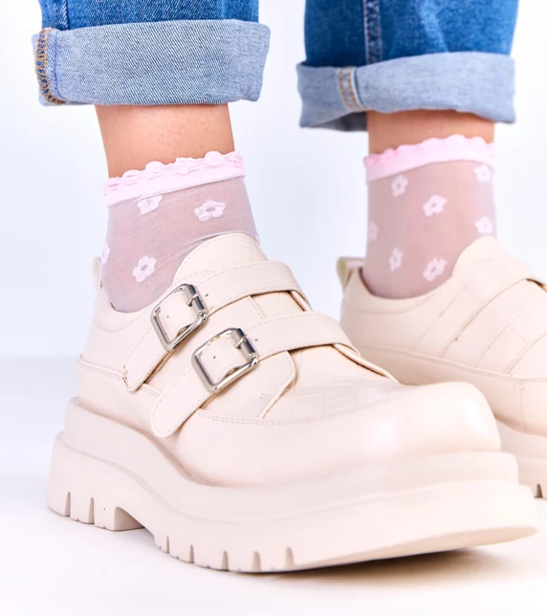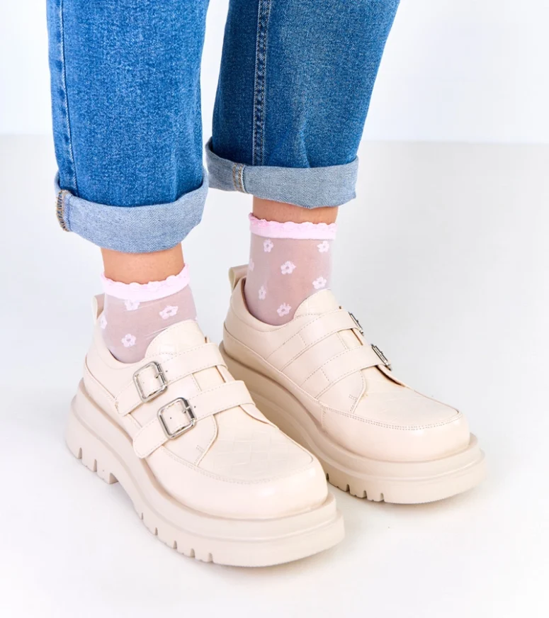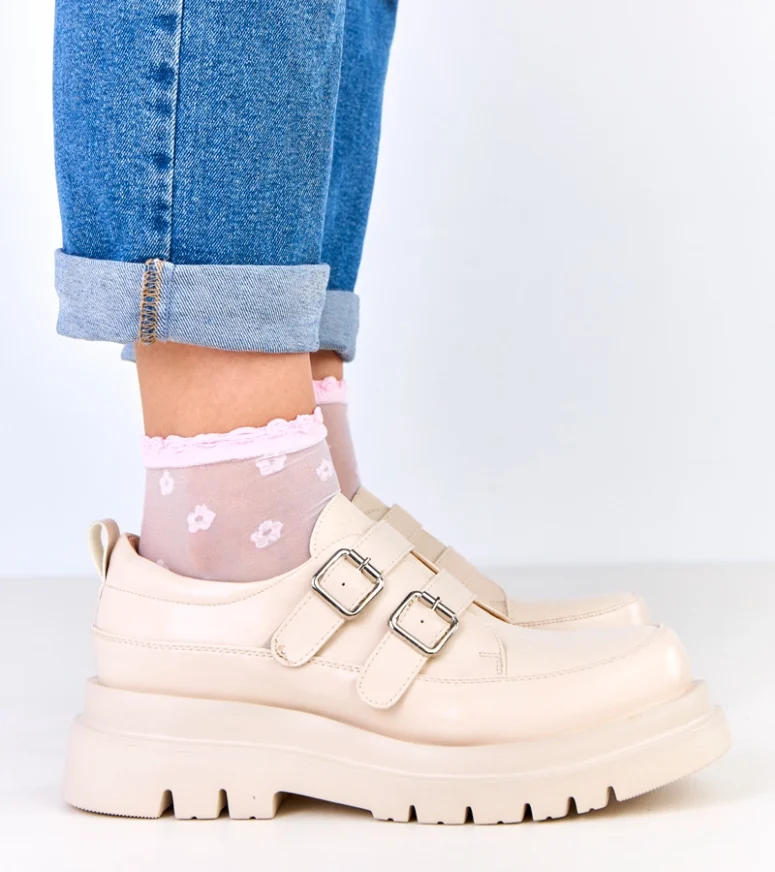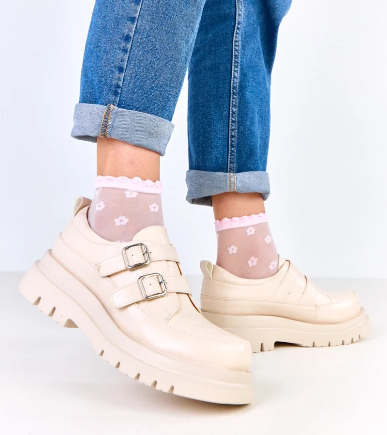 Beżowe półbuty na masywnej podeszwie zdobione klamrami Juke to idealna propozycja dla kobiet, które cenią sobie połączenie nowoczesnego stylu, wygody i ponadczasowej elegancji. Stylowe półbuty damskie w odcieniu subtelnego beżu doskonale wpisują się w aktualne trendy, a jednocześnie pozostają uniwersalne i łatwe w stylizacji. Dzięki masywnej podeszwie oraz efektownym klamrom model ten przyciąga uwagę i stanowi mocny akcent w każdej stylizacji.