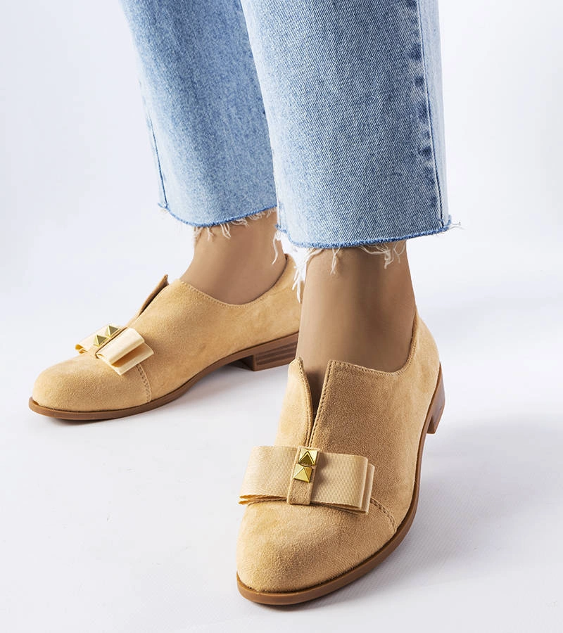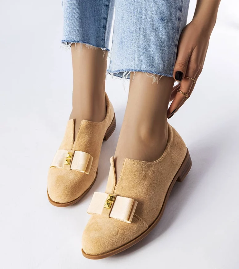 Półbuty Poplar na płaskim obcasem. Niska cholewka przed kostkę. Udekorowane kokardką i ćwiekami. Okrągły nosek i minimalistyczne przeszycia. Wykonane z zamszowej ekoskóry, natomiast wkładka ze skóry naturalnej. Noś do bluzki z dekoracyjnymi łańcuszkami i skórzanej spódnicy. Numeracja standardowa, prosimy kierować się swoim rozmiarem.