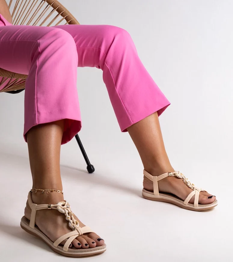 Beżowe sandały z kamyczkami Mimosa to idealny wybór dla młodego pokolenia, które ceni sobie modę i komfort. Te modne sandały są wsuwane, co sprawia, że są niezwykle wygodne i łatwe do założenia. Ozdobione kamyczkami dodają im elegancji i sprawiają, że będą doskonałym dodatkiem do letnich stylizacji. Ich płaski obcas sprawia, że są idealne na gorące dni, kiedy chcesz czuć się swobodnie i lekko. Te chic sandały są nie tylko stylowe, ale także praktyczne i doskonale dopasują się do wielu letnich outfitów.