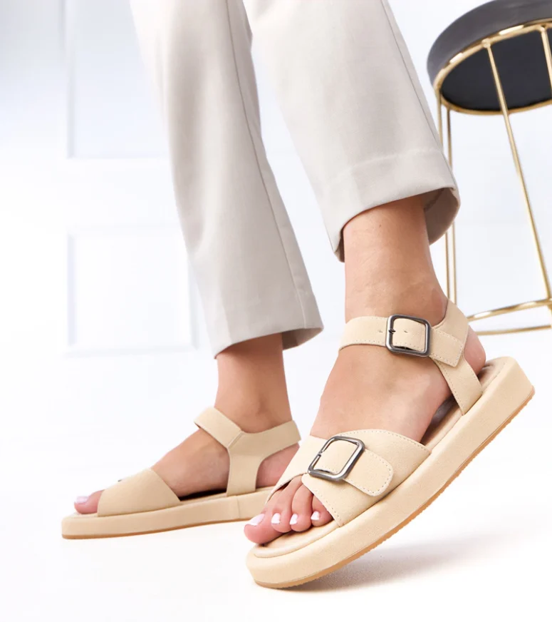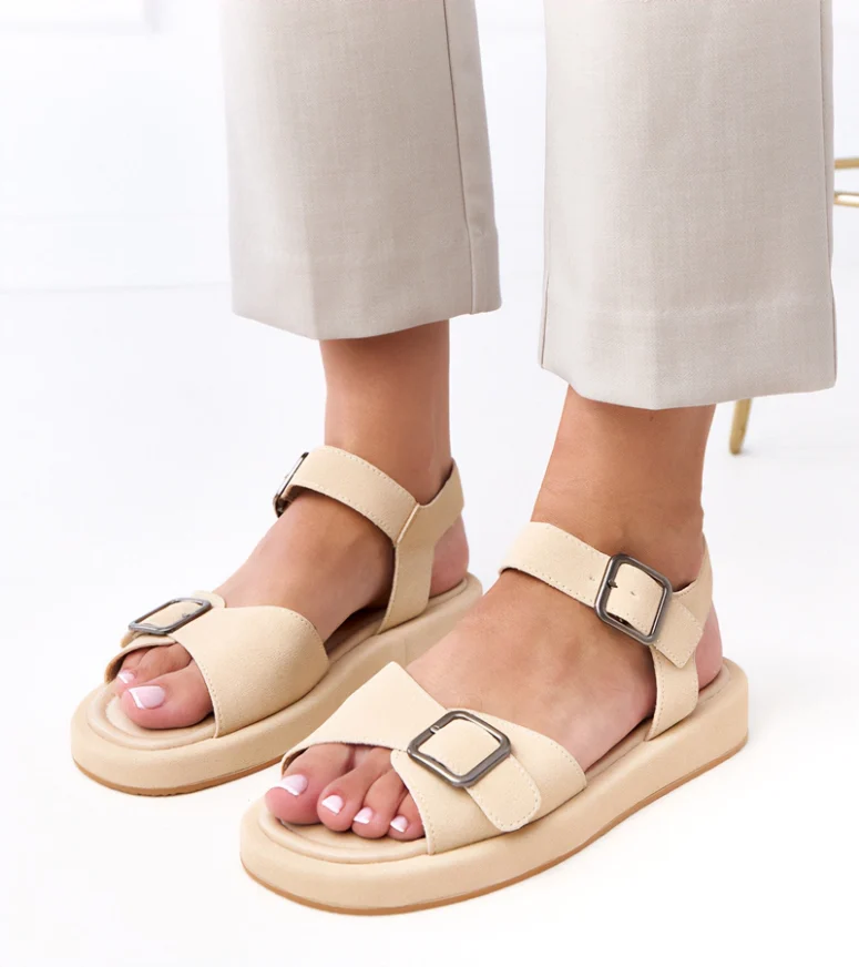 Beżowe sandały z klamrą na pasku wyróżniają się stonowaną kolorystyką, która harmonizuje z większością garderoby. Neutralny beż optycznie wysmukla stopę, a jednocześnie nie dominuje stylizacji, pozwalając swobodnie łączyć sandały z intensywnymi kolorami lub wzorzystymi tkaninami. To niezwykle praktyczny element garderoby kapsułowej, który sprawdzi się o każdej porze dnia.