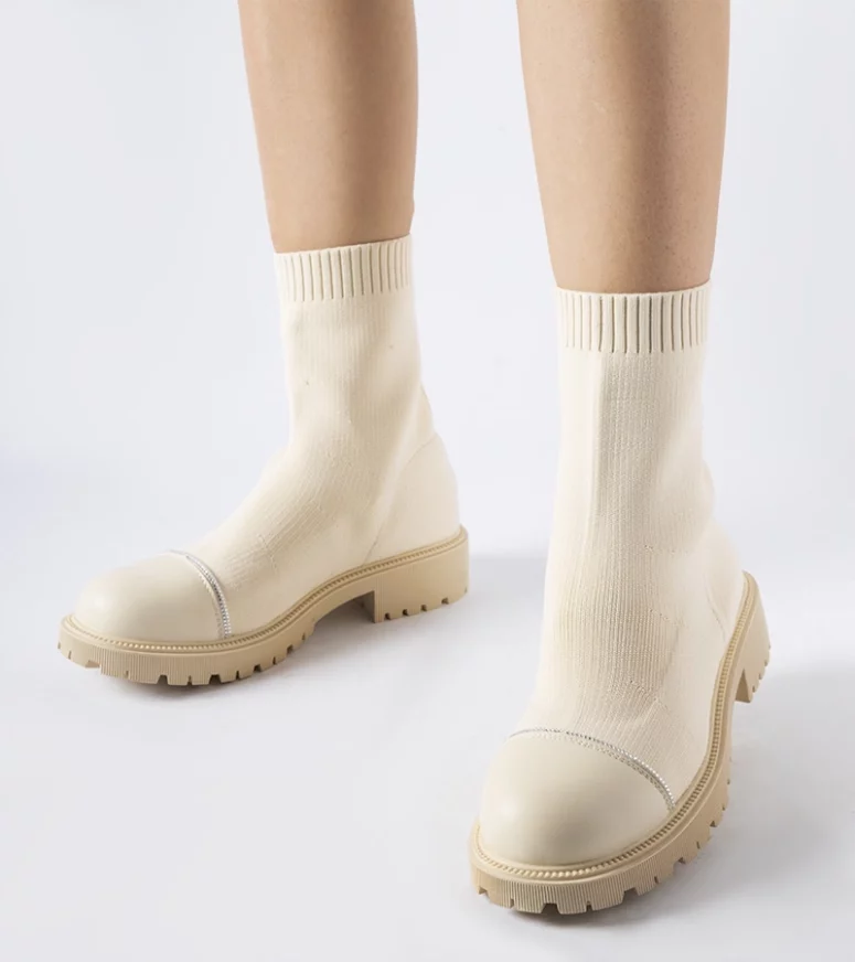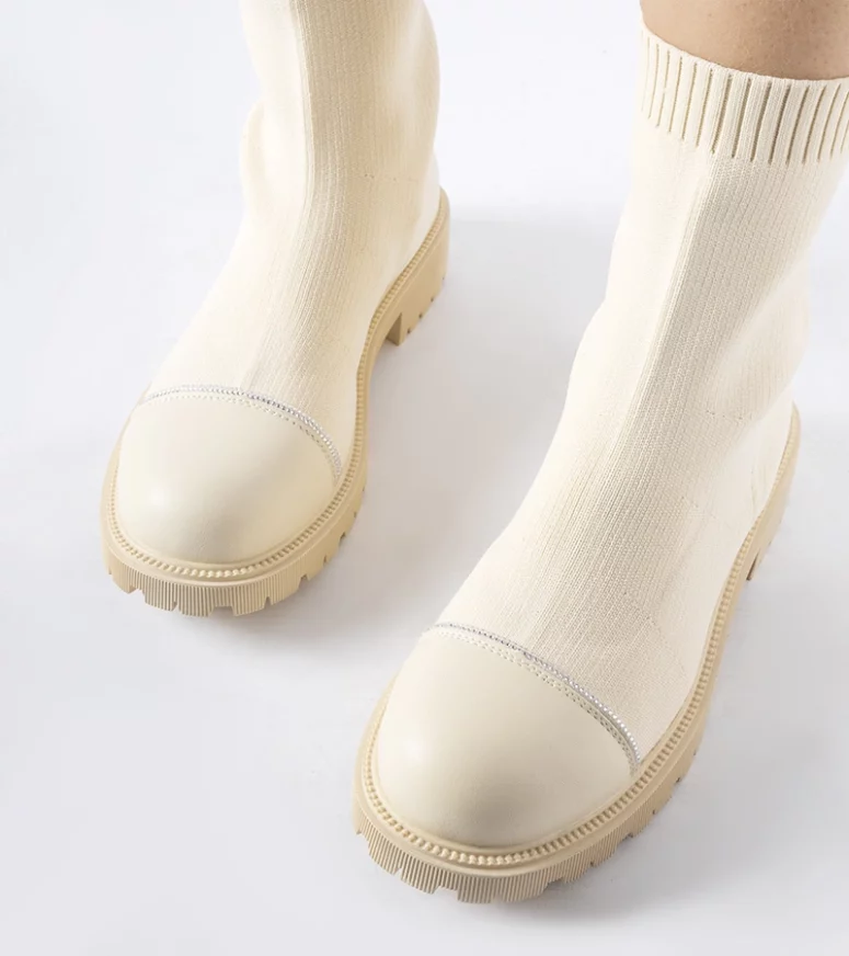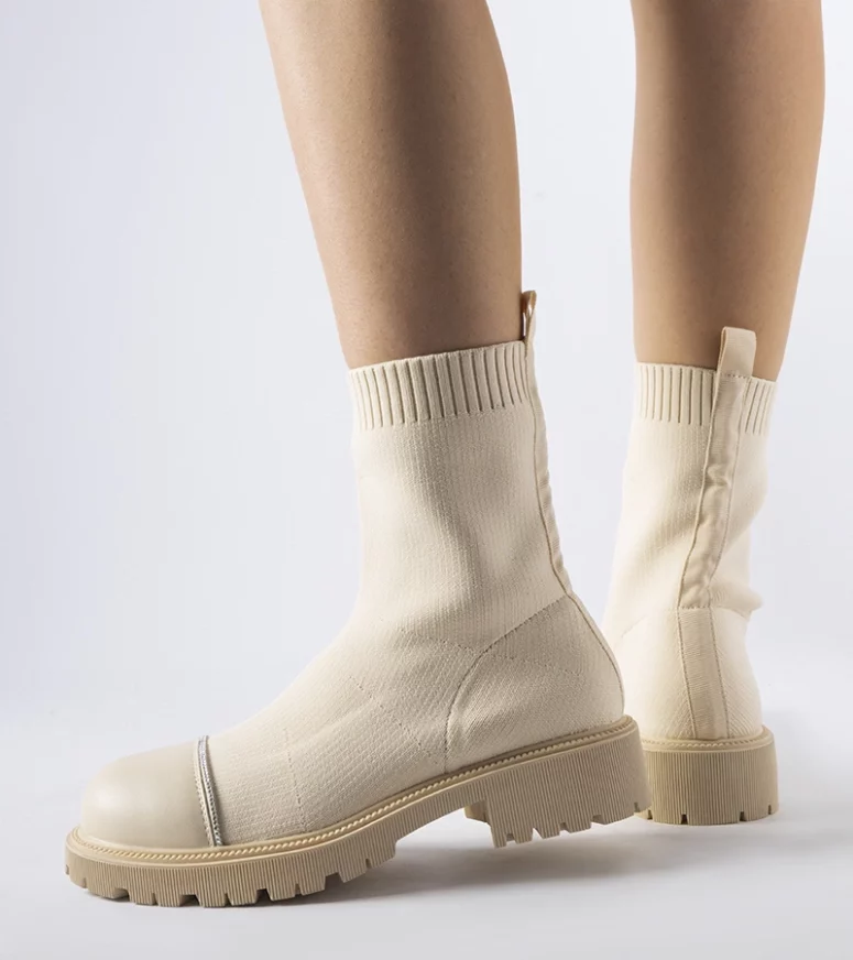 Beżowe skarpetowe botki z cyrkoniami Vail to wysokie za kostkę buty o innowacyjnym designie. Ich główną ozdobą są piękne cyrkonie, które dodają im szlachetności i przyciągają wzrok. Botki wykonane są z elastycznej gumy, co sprawia, że są wygodne i łatwe do założenia – wsuwane na stopę w szybki i prosty sposób. Mają okrągły nosek, który nadaje im elegancji i uniwersalności, pasując do różnych stylizacji. Te beżowe skarpetowe botki z cyrkoniami Vail są prawdziwym hitem sezonu – świetnie prezentują się zarówno w casualowych, jak i bardziej formalnych zestawach, dodając im odrobinę blasku i ekskluzywności.