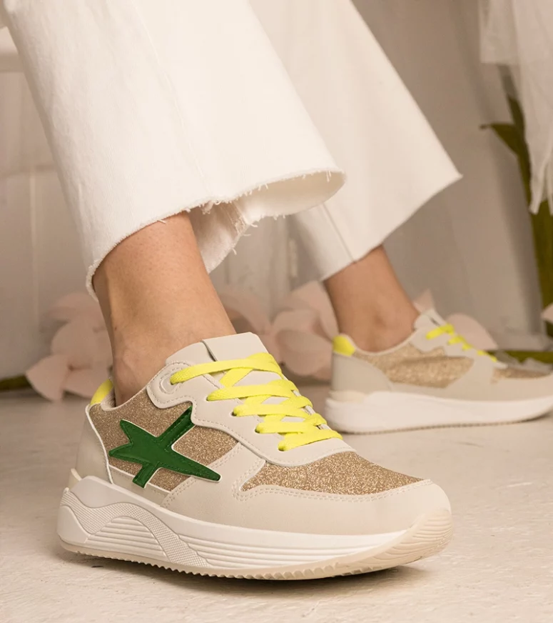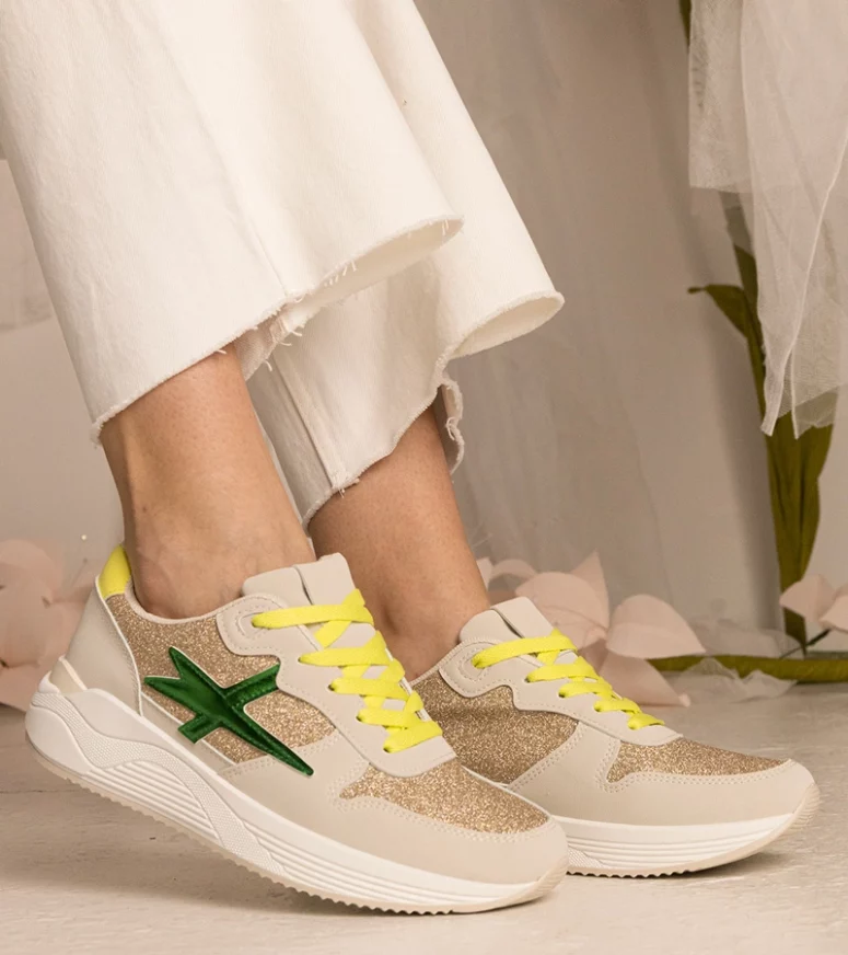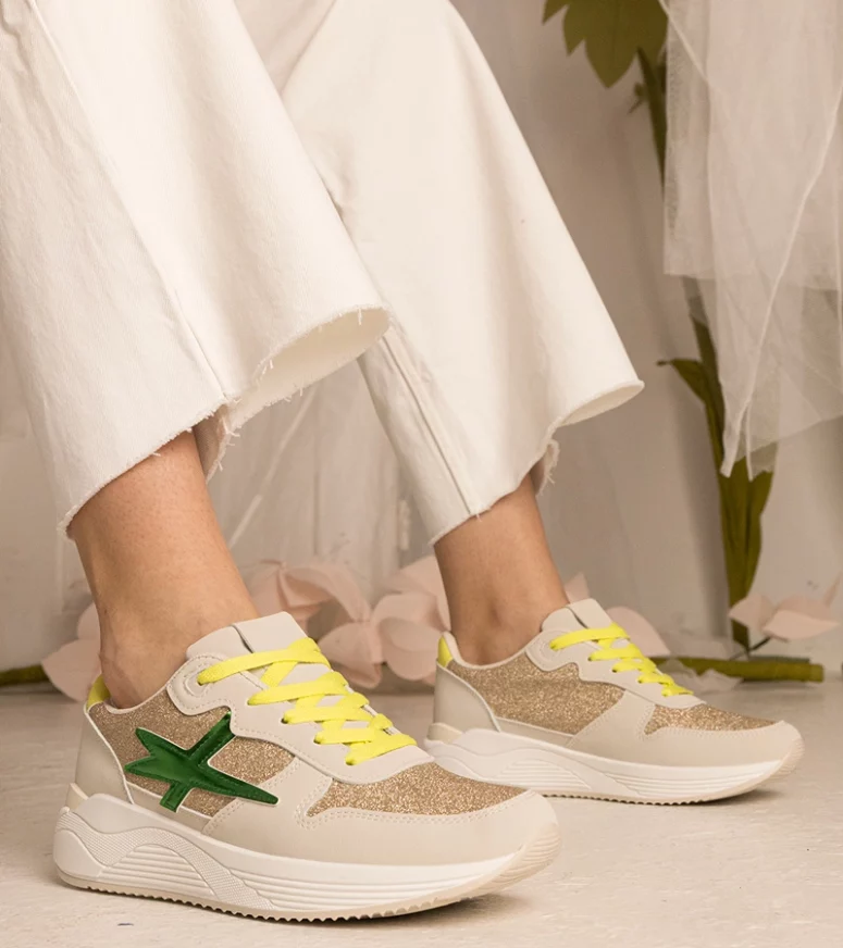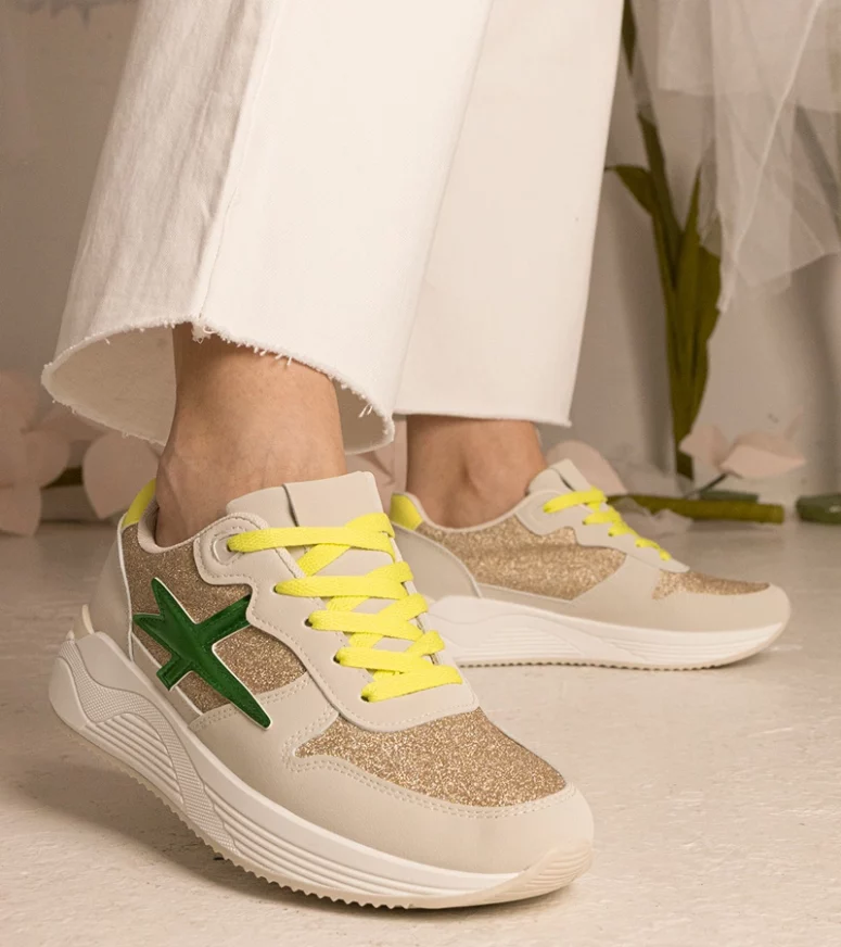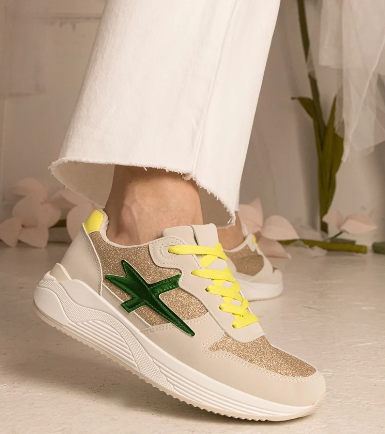 Przedstawiamy beżowe sneakersy damskie sportowe z brokatem Kaletti marki Gemre – idealne obuwie dla każdej kobiety, która ceni sobie styl, wygodę i odrobinę blasku w codziennym życiu. Te wyjątkowe sneakersy zostały zaprojektowane z myślą o nowoczesnych kobietach, które pragną połączyć sportowy charakter z elegancją.