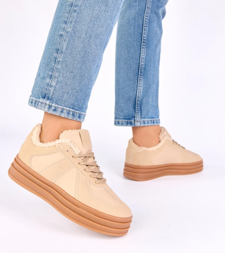 Wnętrze butów zostało starannie ocieplone miękkim futerkiem, które zapewnia przyjemne ciepło nawet w chłodniejsze dni. To idealne rozwiązanie na jesień oraz łagodną zimę, gdy chcesz wyglądać modnie, a jednocześnie chronić stopy przed zimnem. Ocieplane beżowe sneakersy są doskonałą alternatywą dla tradycyjnych botków czy kozaków, oferując lepszą wygodę i swobodę ruchu.
