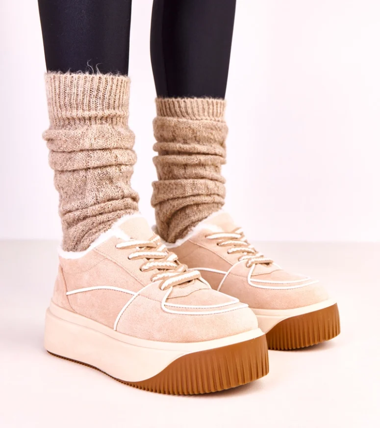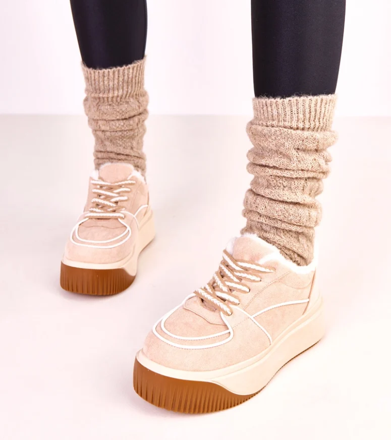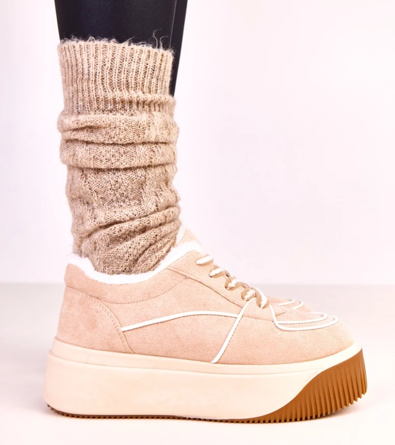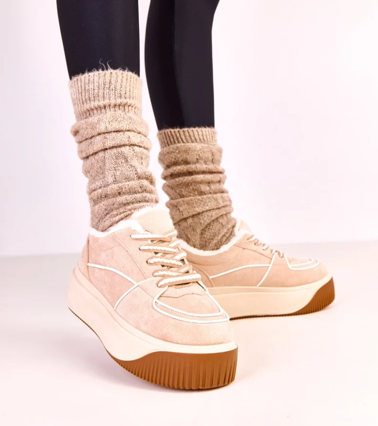 Wykonane z dbałością o detale beżowe ocieplane sneakersy łączą w sobie nowoczesny design i praktyczność. Stabilna platforma delikatnie podnosi sylwetkę, optycznie ją wysmuklając, a jednocześnie gwarantuje komfort chodzenia nawet podczas długich spacerów czy intensywnego dnia w mieście. To idealne sneakersy damskie na platformie dla kobiet, które chcą wyglądać modnie, nie rezygnując z wygody. Neutralny beż świetnie pasuje do dżinsów, legginsów, sukienek i spódnic, dlatego buty te staną się bazą wielu codziennych stylizacji.