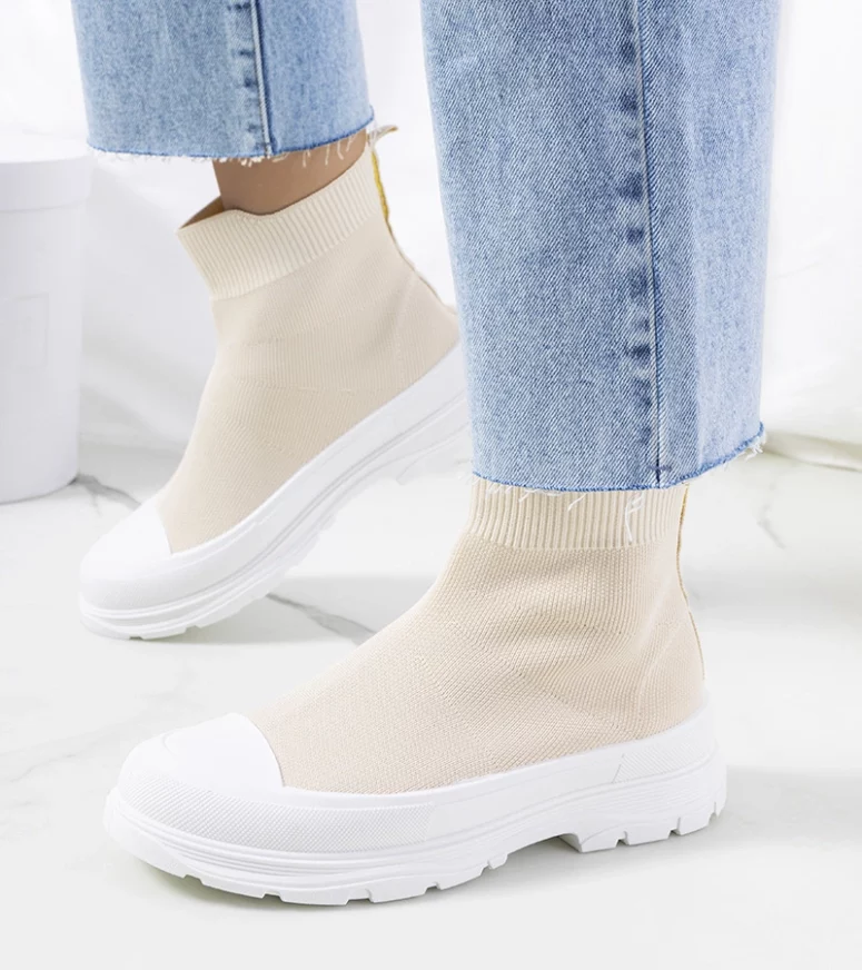 Model Miki z pewnością modnie i oryginalnie dopełni twoje stylizacje 😉 Wysoka masywna podeszwa wygląda BOSKO!. Materiałowa cholewka o fasonie skarpetki została wykonana z wysokiej jakości elastycznego materiału który świetnie przylega do stopy. Numeracja zaniżona, sugerujemy wybrać rozmiar większe.
