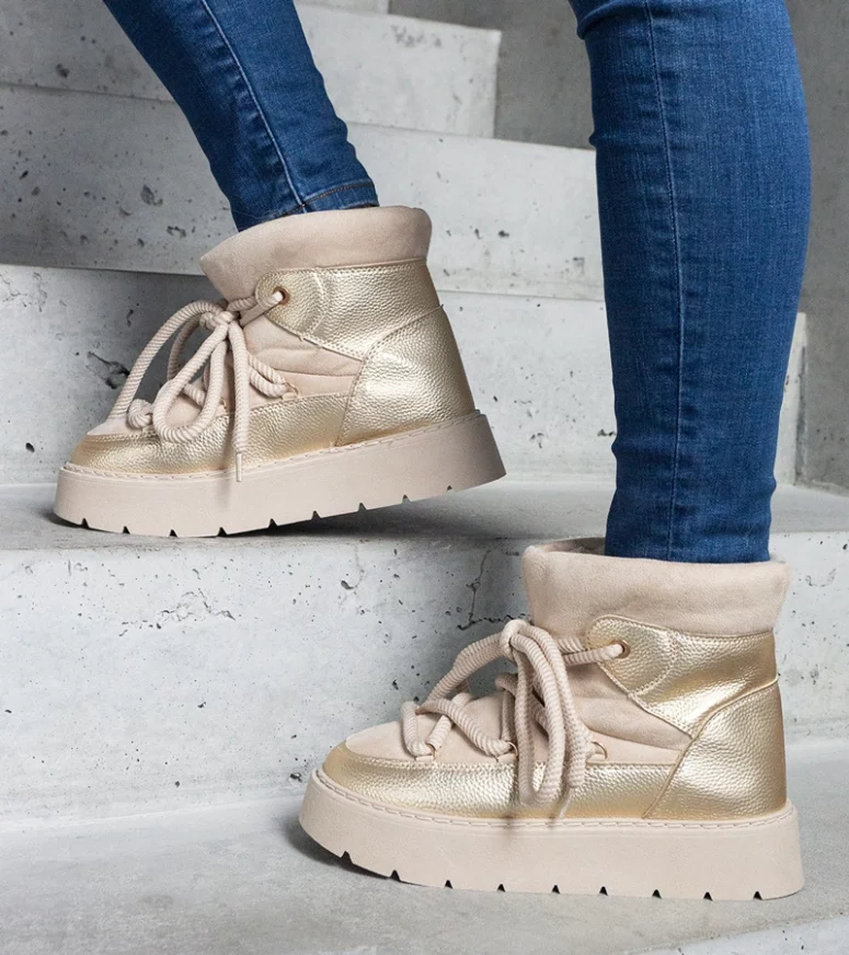 Beżowe śniegowce na platformie ocieplane futerkiem Sapphi to rewolucyjne obuwie dla każdej fasionistki. Sznurowane, ciepłe i zimowe, idealnie sprawdzą się podczas chłodniejszych dni. Wykonane z gumy, posiadają okrągły nosek oraz dodatkowo ocieplające futerko, które zapewni komfort nawet w największe mrozy. Dzięki swojemu trendowemu designowi, te śniegowce będą doskonałym uzupełnieniem każdej zimowej stylizacji. Niech Twoje stopy błyszczą w tych modnych butach na platformie!