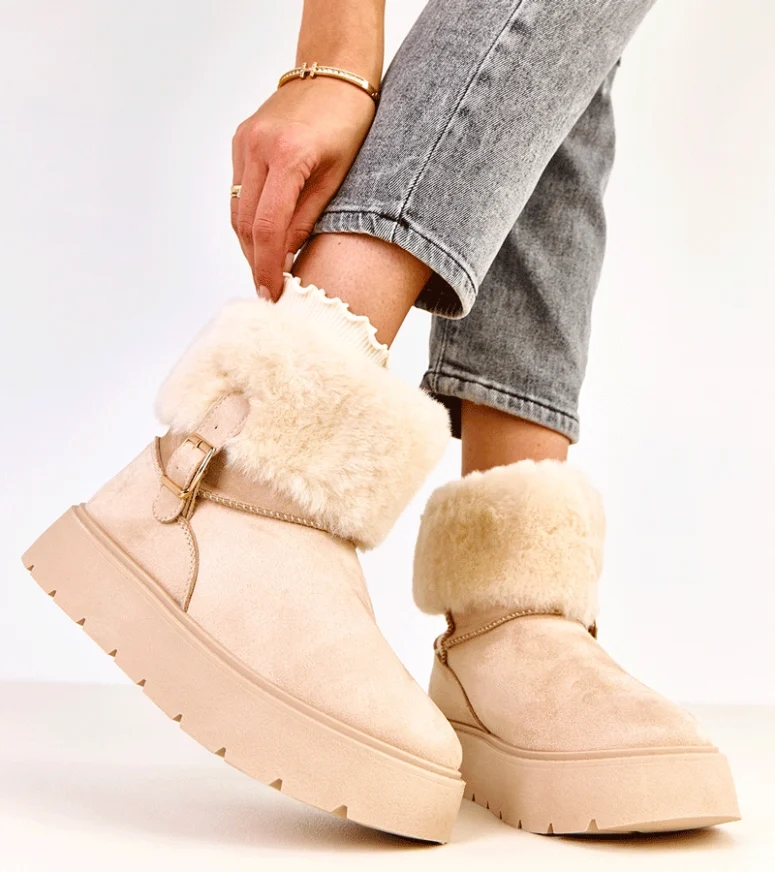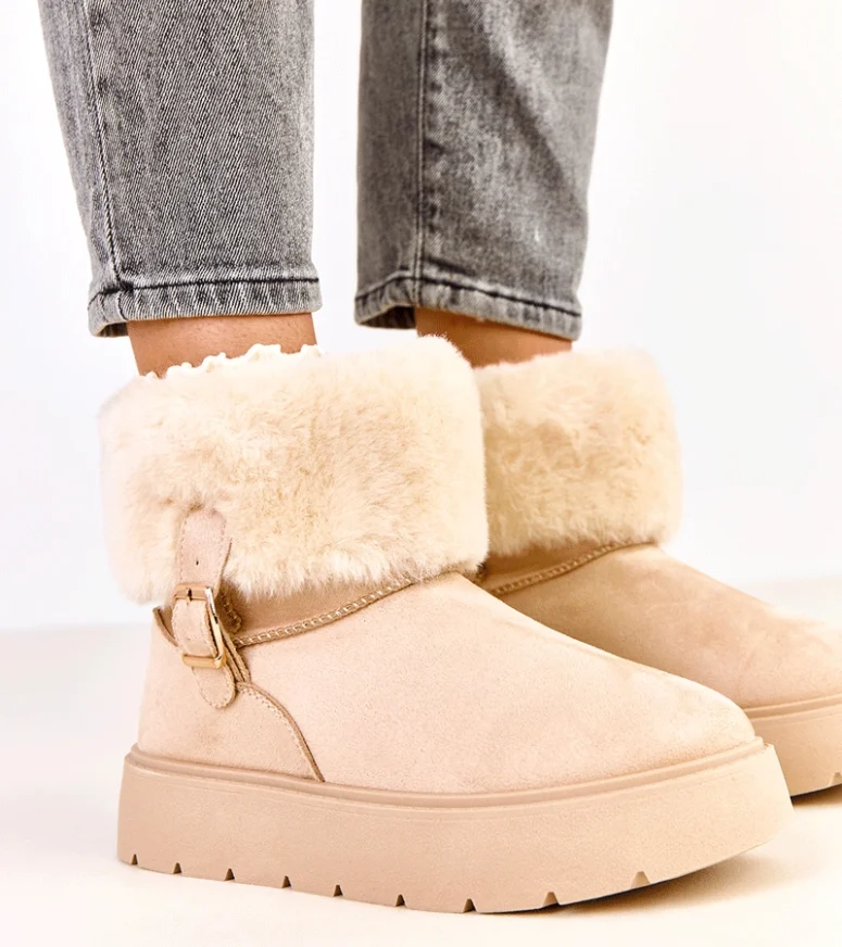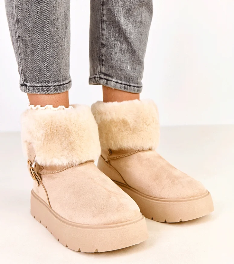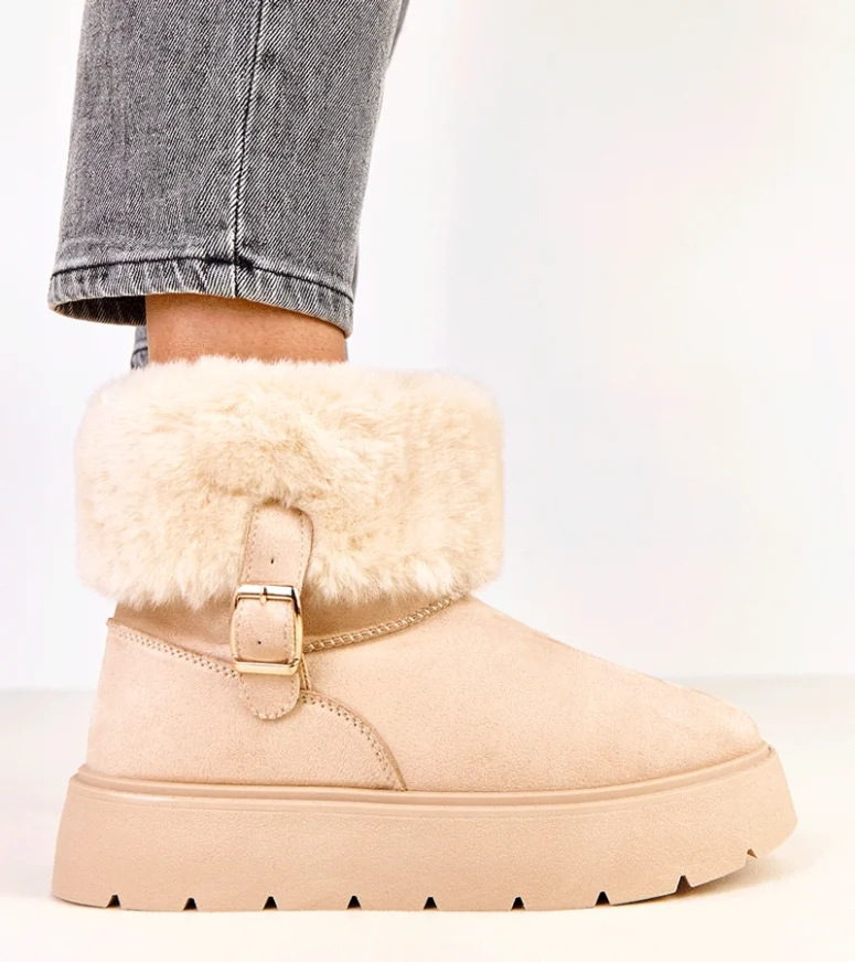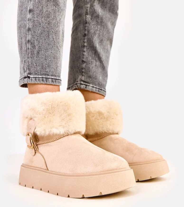 Model ten wyróżnia się nowoczesną platformą, która dodaje kilku centymetrów wzrostu, nie obciążając stóp i nie rezygnując z wygody. Gruba podeszwa zapewnia świetną izolację od zimnego podłoża, dzięki czemu beżowe śniegowce na platformie sprawdzą się zarówno podczas spacerów po mieście, jak i w czasie zimowych wyjazdów. Cholewka buta została ozdobiona elegancką klamerką, która nadaje całości wyjątkowego charakteru i subtelnie podkreśla modny design obuwia. To detal, który sprawia, że śniegowce na platformie Salini wyróżniają się na tle innych modeli.