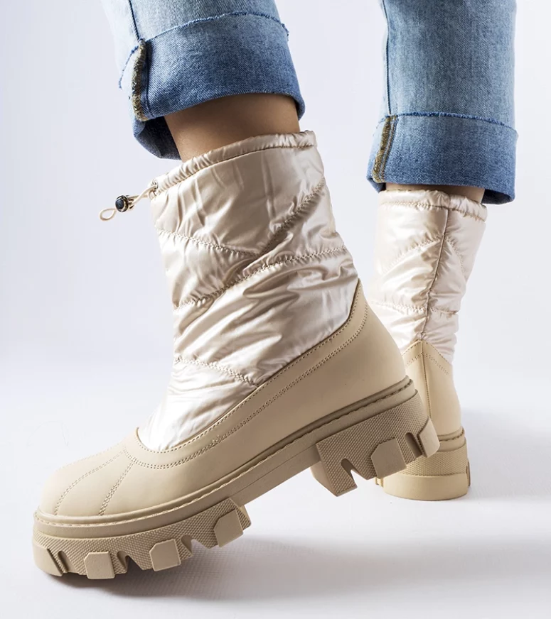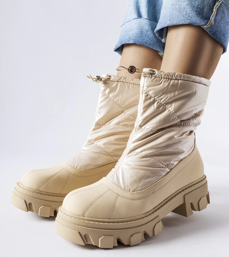Ich wysokość za kostkę zapewnia dodatkową ochronę przed zimnem i wilgocią, jednocześnie podkreślając kobiecą elegancję. Okrągły nosek nadaje im delikatny wygląd, który doskonale komponuje się zarówno z codziennymi, jak i bardziej formalnymi stylizacjami. Dobrze izolowane wnętrze sprawia, że śniegowce Cendrillon są niezwykle ciepłe, nawet w najzimniejsze dni. Dodatkowo, płaski obcas gwarantuje stabilność i pewność kroków na każdej powierzchni. Śniegowce Cendrillon to perfekcyjne połączenie funkcjonalności i stylu. Ich beżowy kolor jest ponadczasowy i łatwo dopasować je do różnych ubrań. Bez wątpienia są one nieodzownym elementem garderoby każdej modnej kobiety. Szycie tych śniegowców jest starannie wykonane, co gwarantuje ich długotrwałość i trwałość. Niezależnie od tego, czy planujesz długie spacery po zaśnieżonym mieście, czy też potrzebujesz czegoś wygodnego do noszenia na co dzień, beżowe śniegowce ze ściągaczem Cendrillon są doskonałym wyborem.