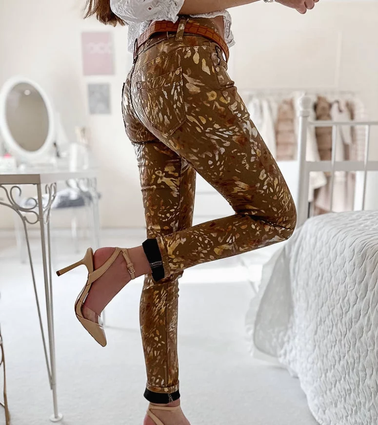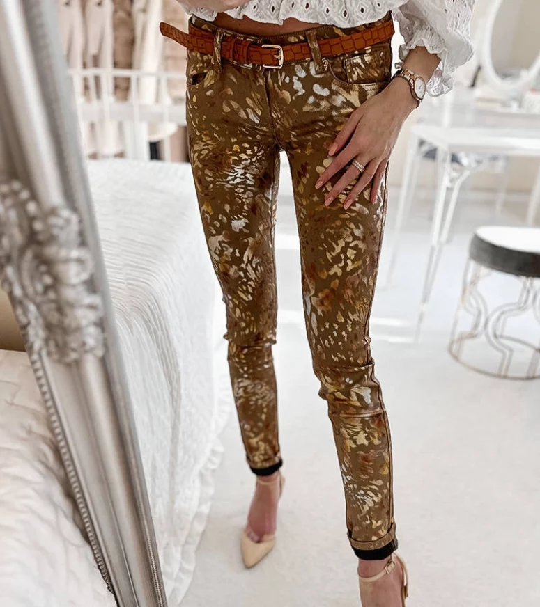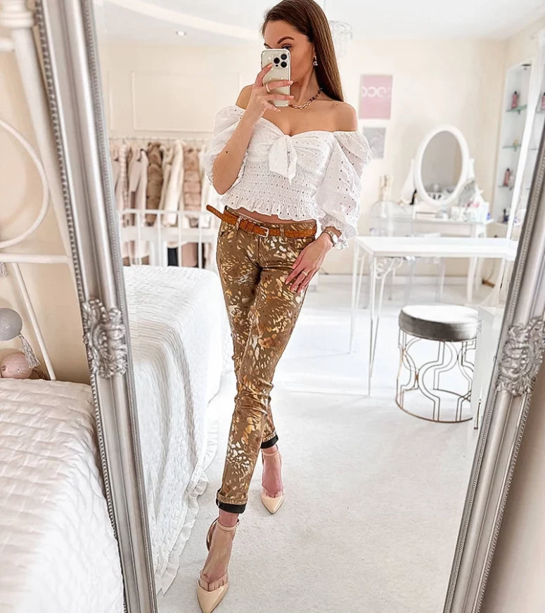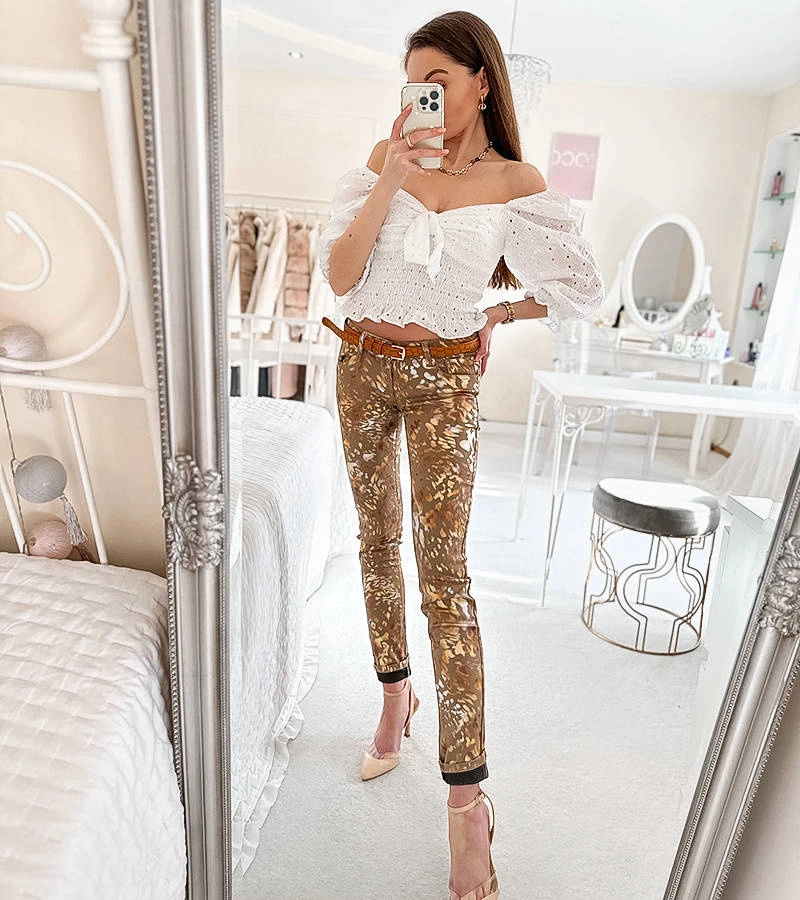 Beżowe spodnie w złotą panterkę Lévesque to sztos na czasie dla każdej fasionistki! Ich modernistyczny design idealnie wpisuje się w dzisiejsze trendy, a jednocześnie pozostaje ponadczasowy. Te damskie spodnie są wykonane z wysokiej jakości materiału, co gwarantuje ich trwałość i wygodę noszenia. Złota panterka dodaje im nieco ekstrawagancji, dzięki czemu stanowią doskonały element stylizacji na wiele okazji. Niezależnie od tego, czy chcesz je zestawić z elegancką koszulą, czy też z luźnym T-shirtem, te beżowe spodnie w złotą panterkę Lévesque będą zawsze wyglądać świetnie!