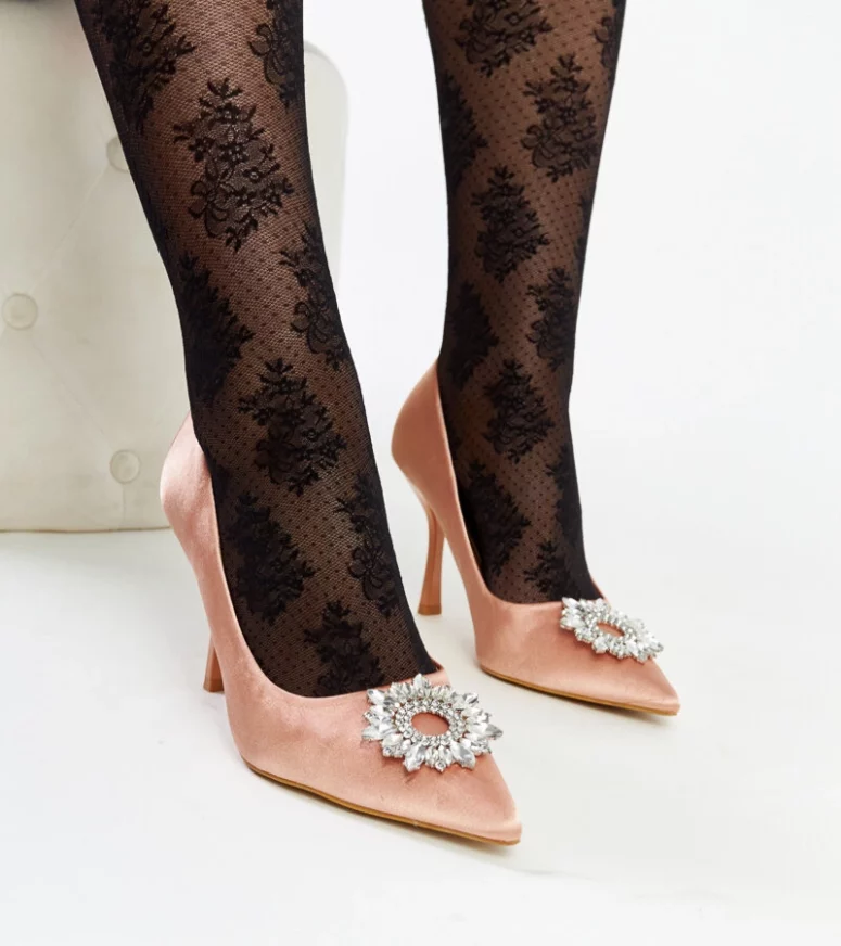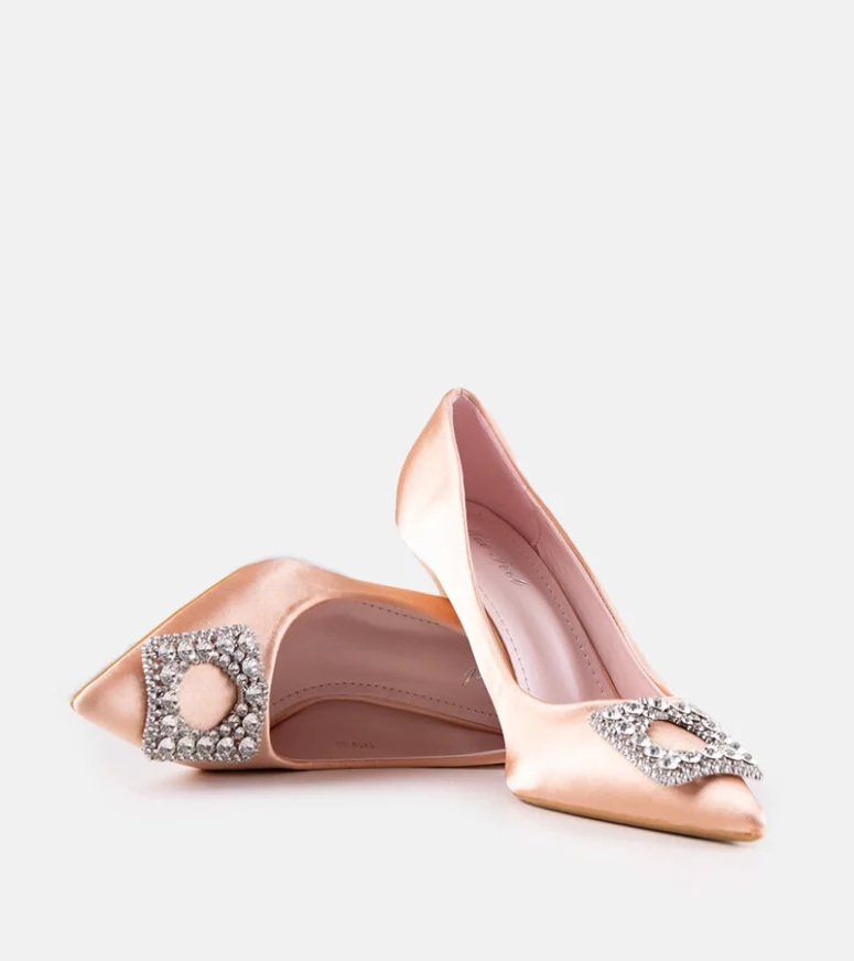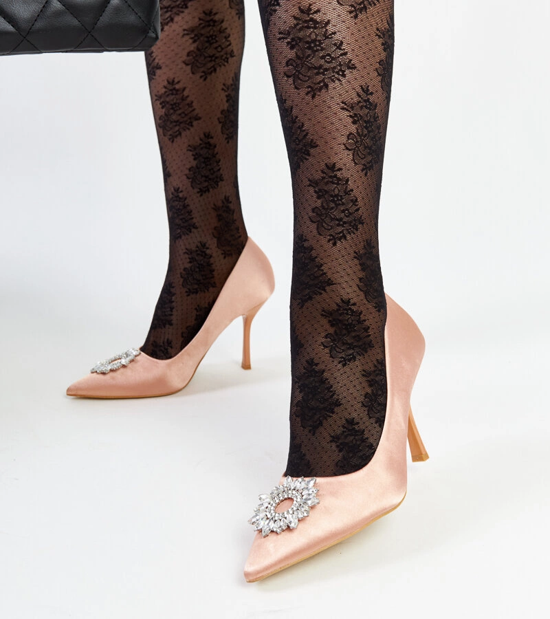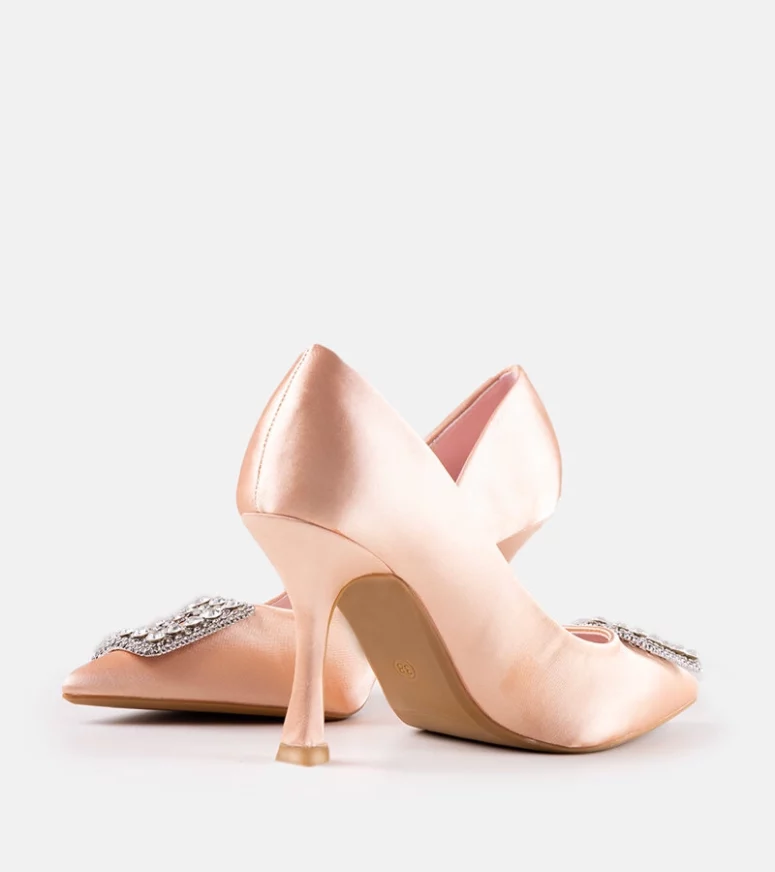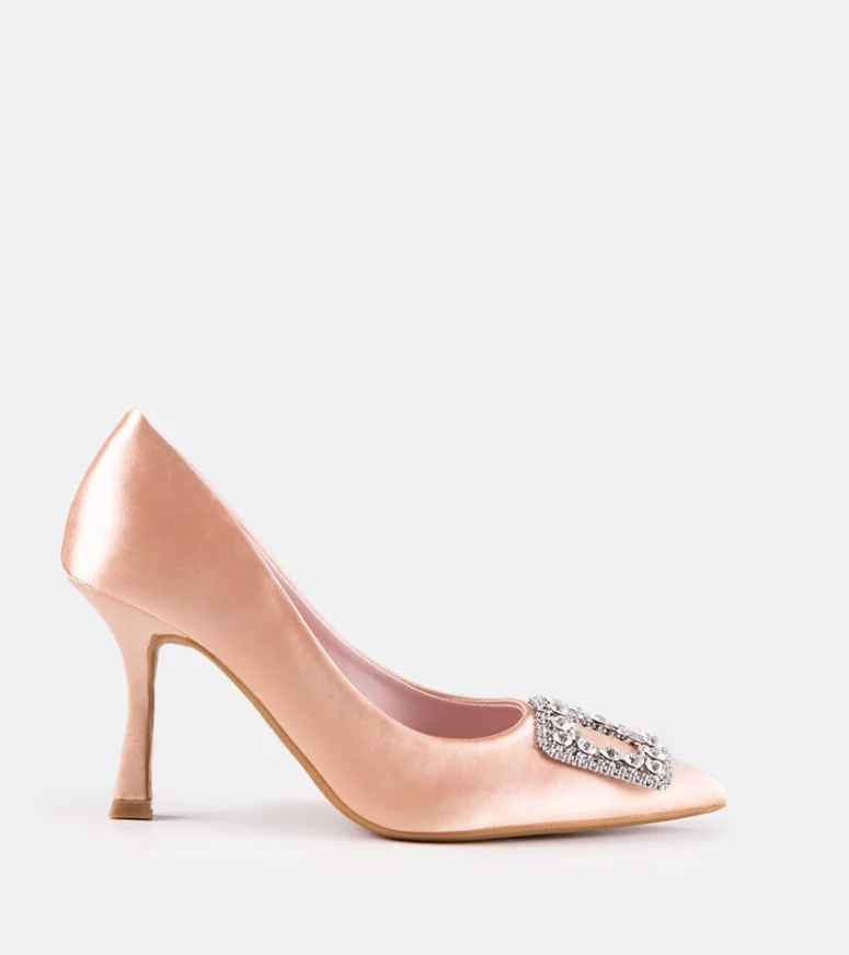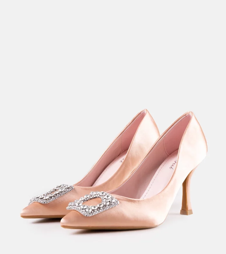 Beżowe szpilki o satynowym wykończeniu z cyrkoniami Clemente to must-have na letnie dni! Wykonane z tworzywa sztucznego, na wysokim obcasie i ze szpicowatym nosem, te trendy buty są idealne na gorące dni. Wsuwane i ozdobione cyrkoniami, prezentują się nowocześnie i stylowo. Te modernistyczne szpilki sprawią, że każda stylizacja będzie wyglądać perfekcyjnie!