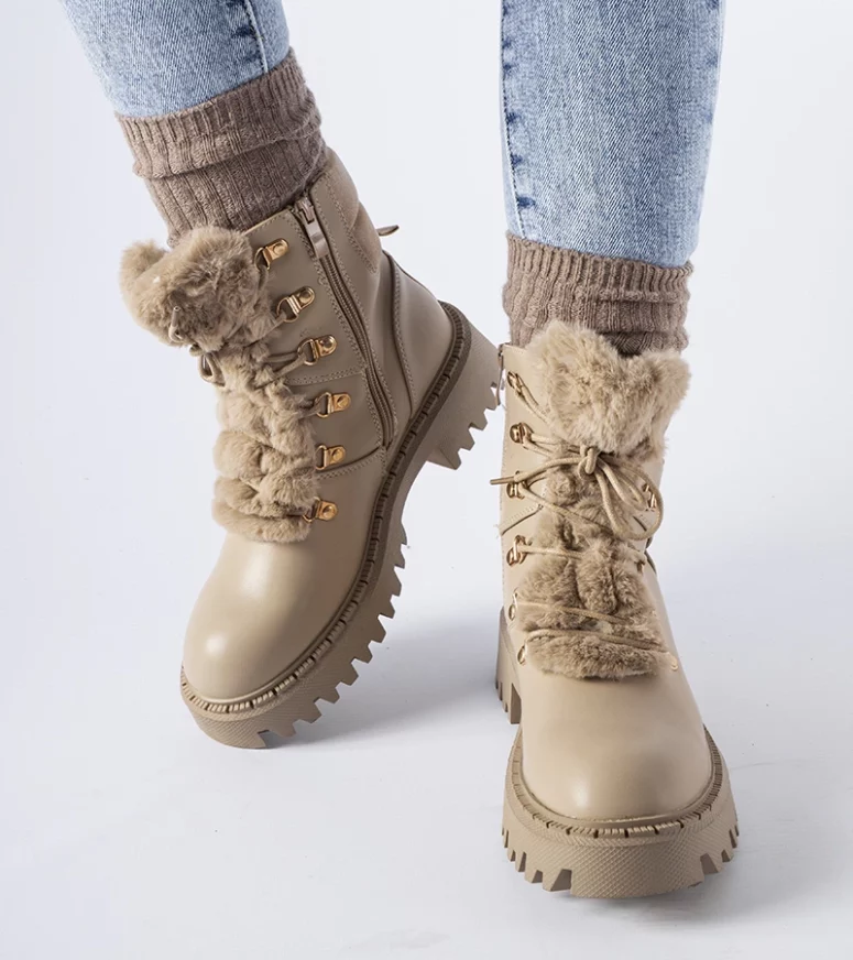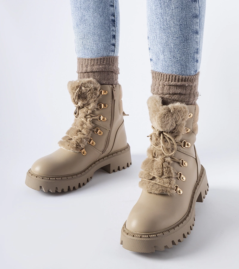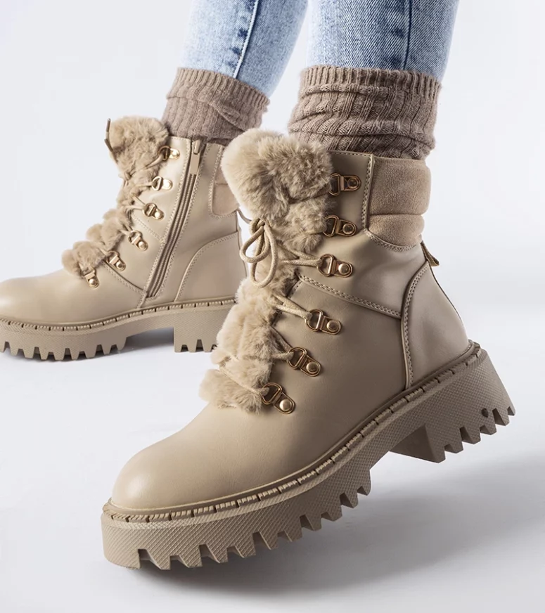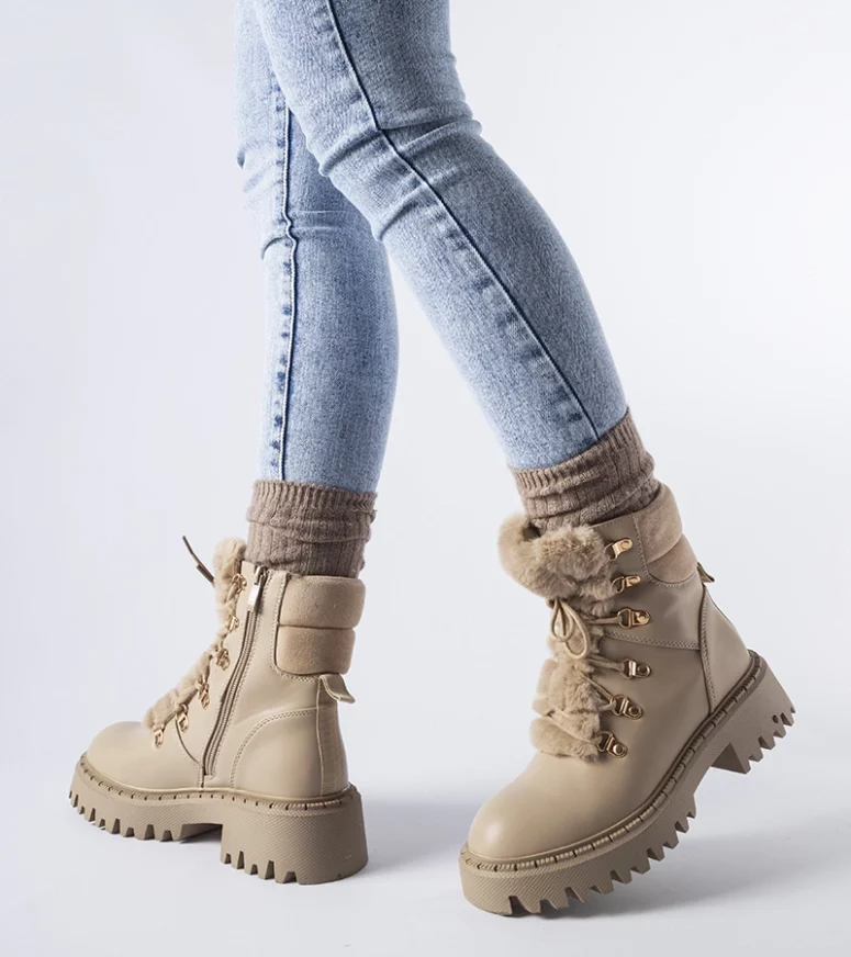 Stylowe workery posiadają średni obcas, który dodaje im subtelnej kobiecości. Okrągły nosek zapewnia wygodę podczas noszenia, a gumowa podeszwa zapewnia odpowiednią przyczepność na różnych powierzchniach. Buty są ocieplane i ciepłe, idealne na zimowe miesiące. Ich wysokość za kostkę dodaje charakteru, jednocześnie chroniąc stopy przed niskimi temperaturami. Dodatkowo, sznurowane wykonanie pozwala na idealne dopasowanie do indywidualnych potrzeb. Zestawienie beżowego koloru z ozdobnym futerkiem nadaje tym workom unikalnego charakteru. Ich modernistyczny design z pewnością przyciągnie uwagę i sprawi, że będziesz wyróżniać się w tłumie. Wybierając te beżowe workery z ozdobnym futerkiem Quarto, otrzymujesz nie tylko modny i elegancki produkt, ale także komfort i funkcjonalność na co dzień. Idealnie pasują zarówno do casualowych, jak i bardziej formalnych stylizacji, dzięki czemu możesz nosić je praktycznie przy każdej okazji.