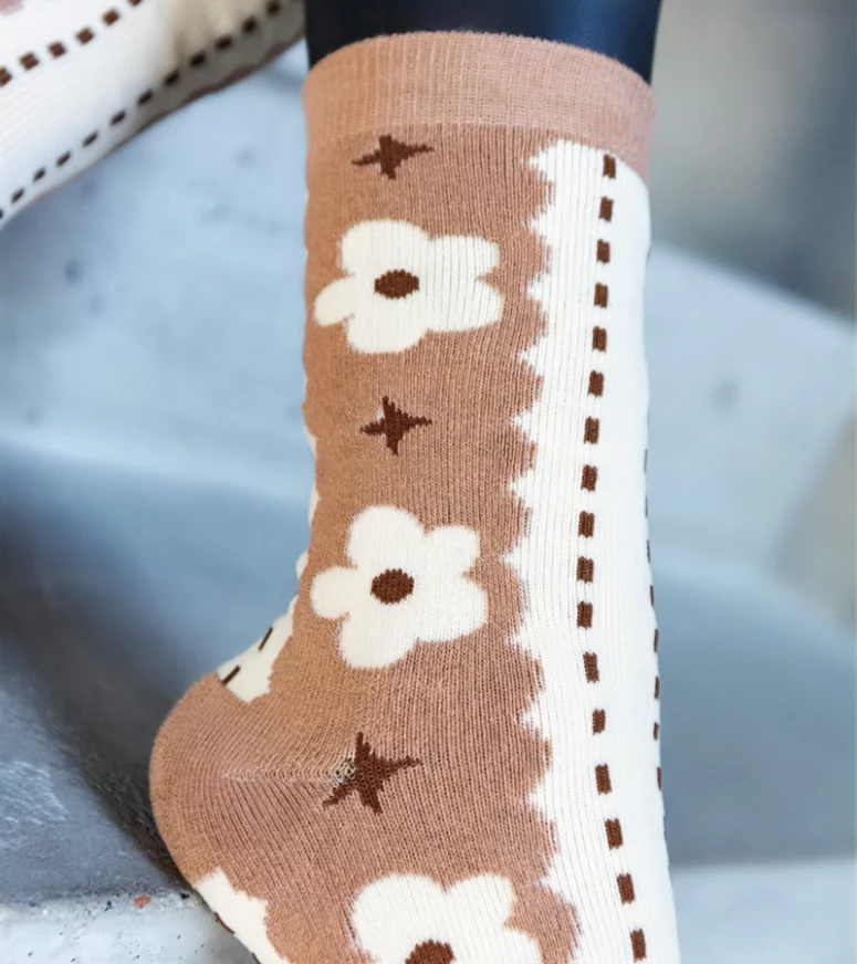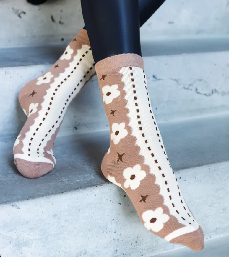 Beżowo-białe ciepłe skarpetki z kwiatkami Sella