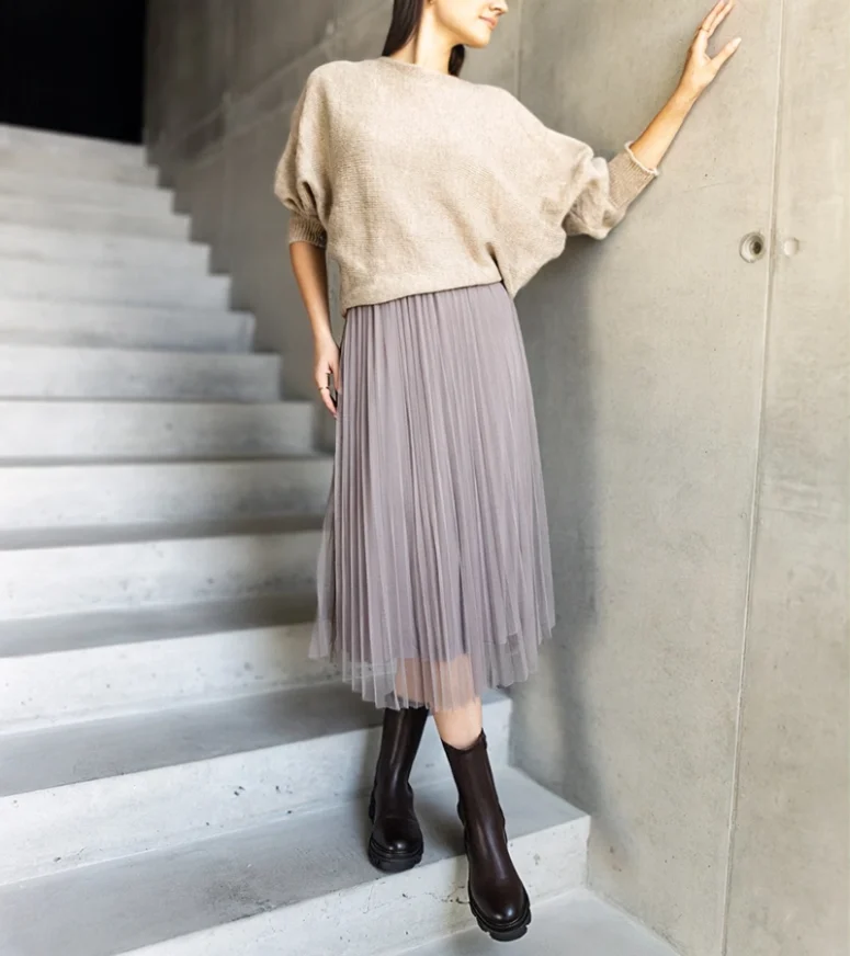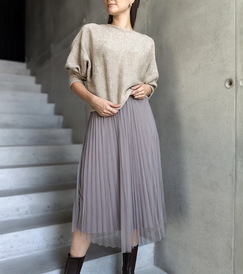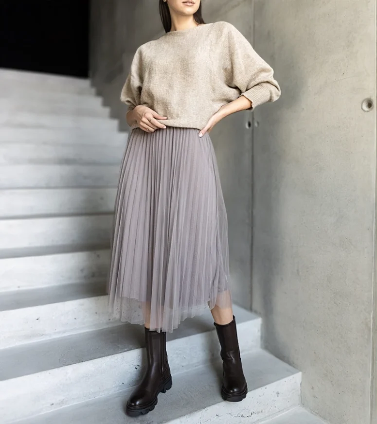 Beżowy komplet sweterek i sukienka z tiulem Sorenla