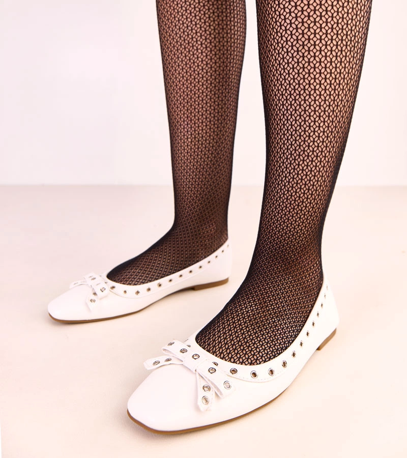 Białe baleriny z ozdobnymi oczkami i kokardką Baisa
