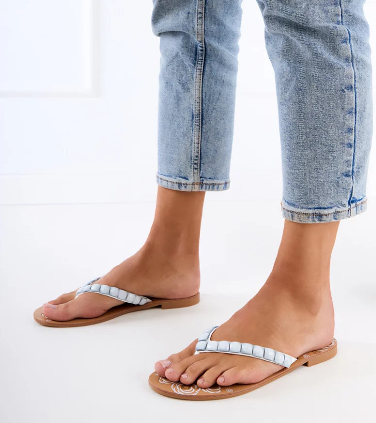 Model Liwiros wyróżnia się klasycznym fasonem japonek, który delikatnie eksponuje stopę i podkreśla letni charakter obuwia. Dzięki lekkiej konstrukcji oraz wygodnej podeszwie, białe klapki japonki zapewniają komfort noszenia nawet przez wiele godzin. Ozdobne kamienie, którymi udekorowano paski, pięknie odbijają światło i przyciągają spojrzenia, dodając stylizacjom blasku. To propozycja dla kobiet lubiących modowe dodatki, które są zarówno praktyczne, jak i efektowne.