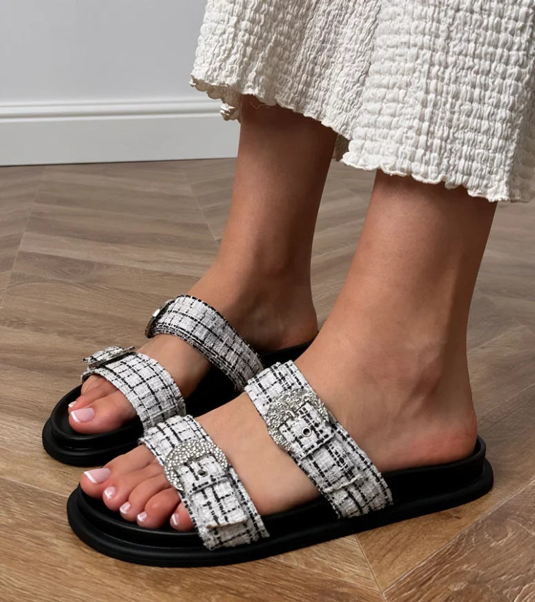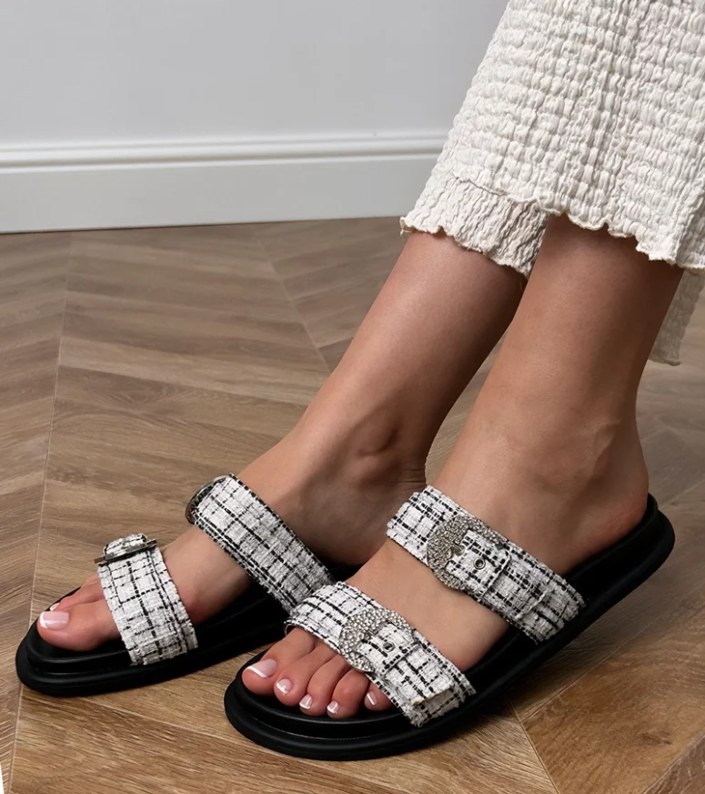 Klapki Lalis wyróżniają się nowoczesnym designem. Posiadają dwa szerokie paski, które stabilnie trzymają stopę, a jednocześnie pięknie ją eksponują. Ozdobne cyrkonie na klamrach dodają im wyjątkowego charakteru i subtelnego blasku, przyciągając wzrok przy każdym kroku. Ten modny detal sprawia, że klapki damskie idealnie wpisują się w aktualne trendy i doskonale uzupełniają letnie stylizacje.
