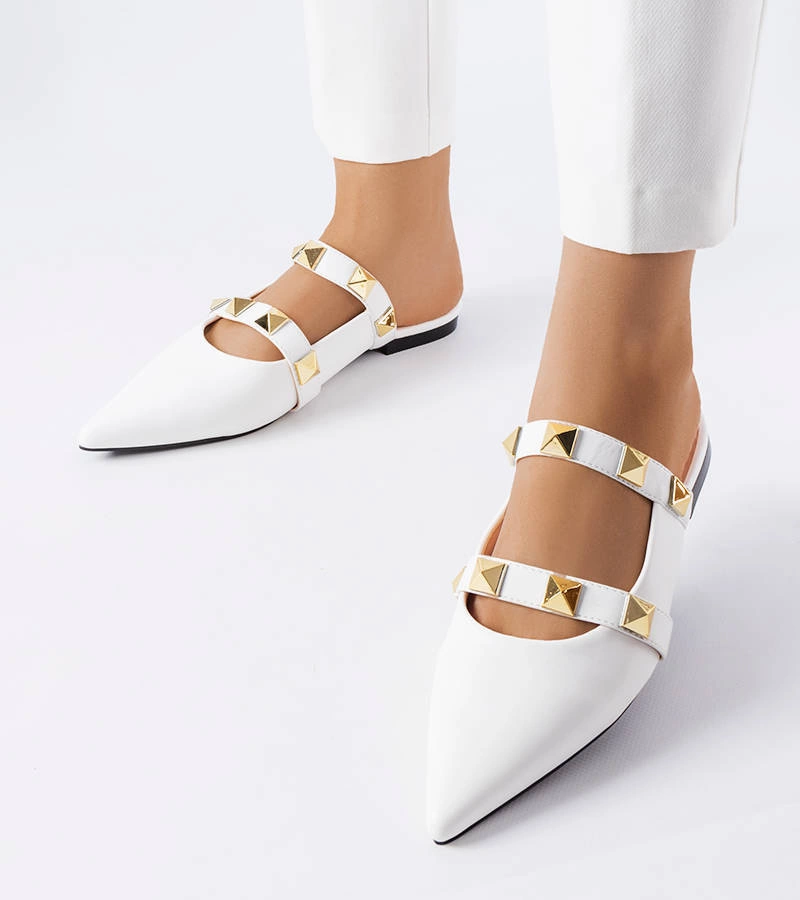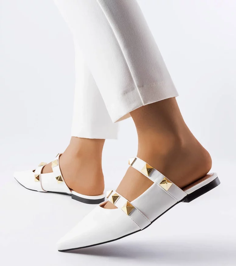 Klapki Ruckman ze szpiczastym noskiem, wsuwane. Zabudowane z przodu oraz po bokach, wycięte na pięcie i śródstopiu. Osadzone na płaskim obcasie. Ozdobione dwoma paskami z ćwiekami. Wykonane ze skóry ekologicznej. Najlepiej leżą na wąskiej stopie. Lubisz nosić nowoczesne, niespotykane buty i dodatki? Koniecznie zaopatrz się w te klapki! Numeracja standardowa, sugerujemy kierować się swoim rozmiarem.