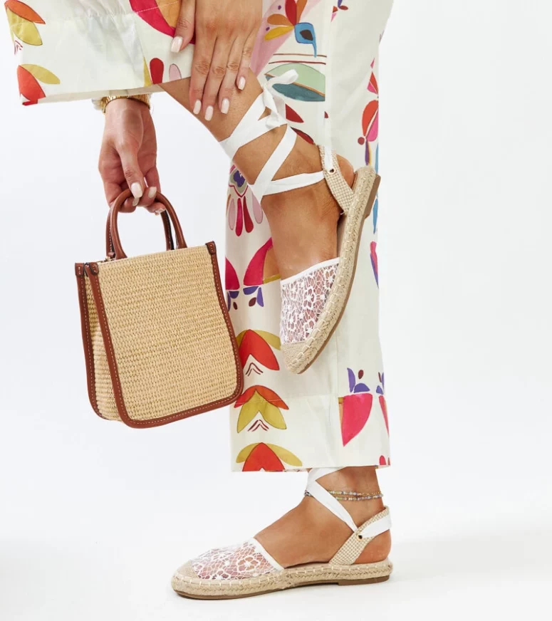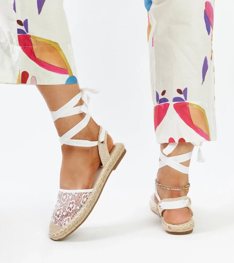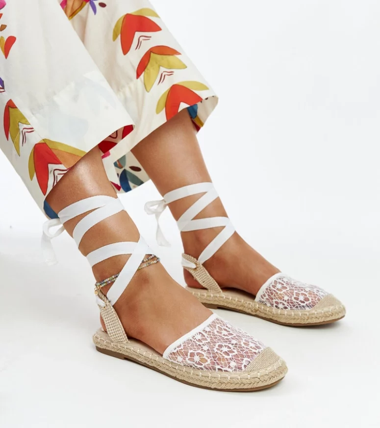 Białe koronkowe espadryle z odkrytą piętą Teha to idealne obuwie na gorące dni. Ich okrągły nosek oraz innowacyjny design sprawiają, że są nie tylko wygodne, ale także stylowe. Dodatkowo, dzięki wsuwanej konstrukcji oraz wiązanym detalom, zapewniają doskonałe dopasowanie. Espadryle posiadają płaski obcas wykonany z elastycznej gumy, co gwarantuje komfort noszenia przez cały dzień. To idealny wybór na letnie dni, gdy chcesz poczuć się modnie i swobodnie jednocześnie.