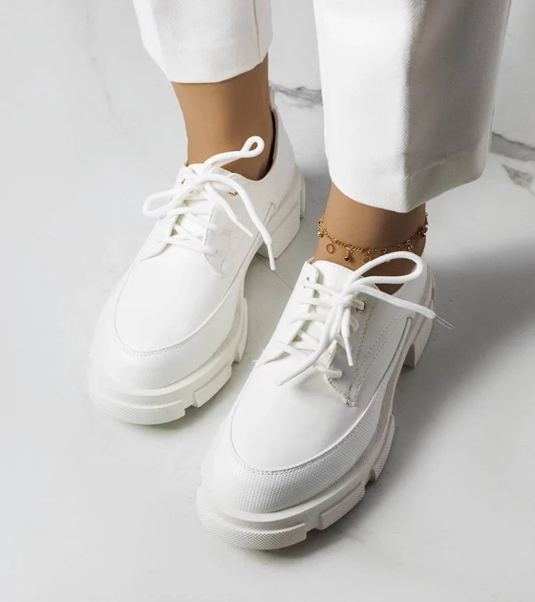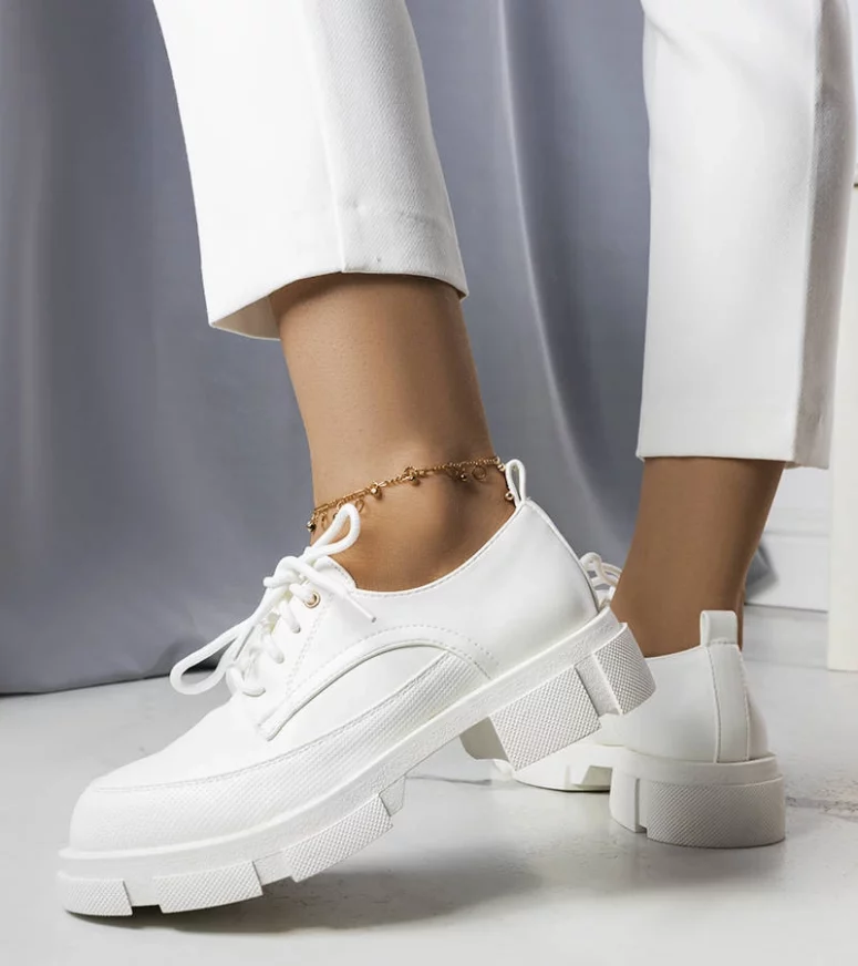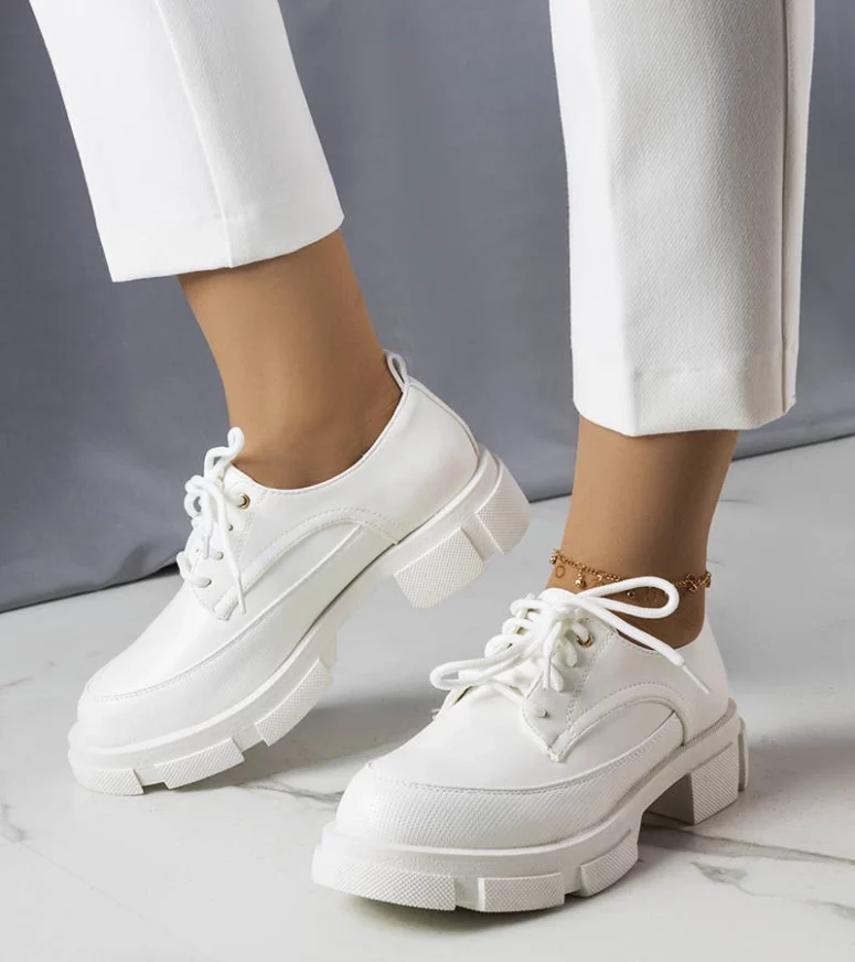 Półbuty Kay na modnej, traktorowej podeszwie z kwadratowym obcasem. Niska cholewka przed kostkę. Z przodu krótkie sznurowanie. Okrągły nosek i minimalistyczne przeszycia. Wykonane ze skóry ekologicznej razem z wkładką. Noś do bluzki z dekoracyjnymi łańcuszkami i skórzanej spódnicy. Numeracja standardowa, prosimy kierować się swoim rozmiarem.