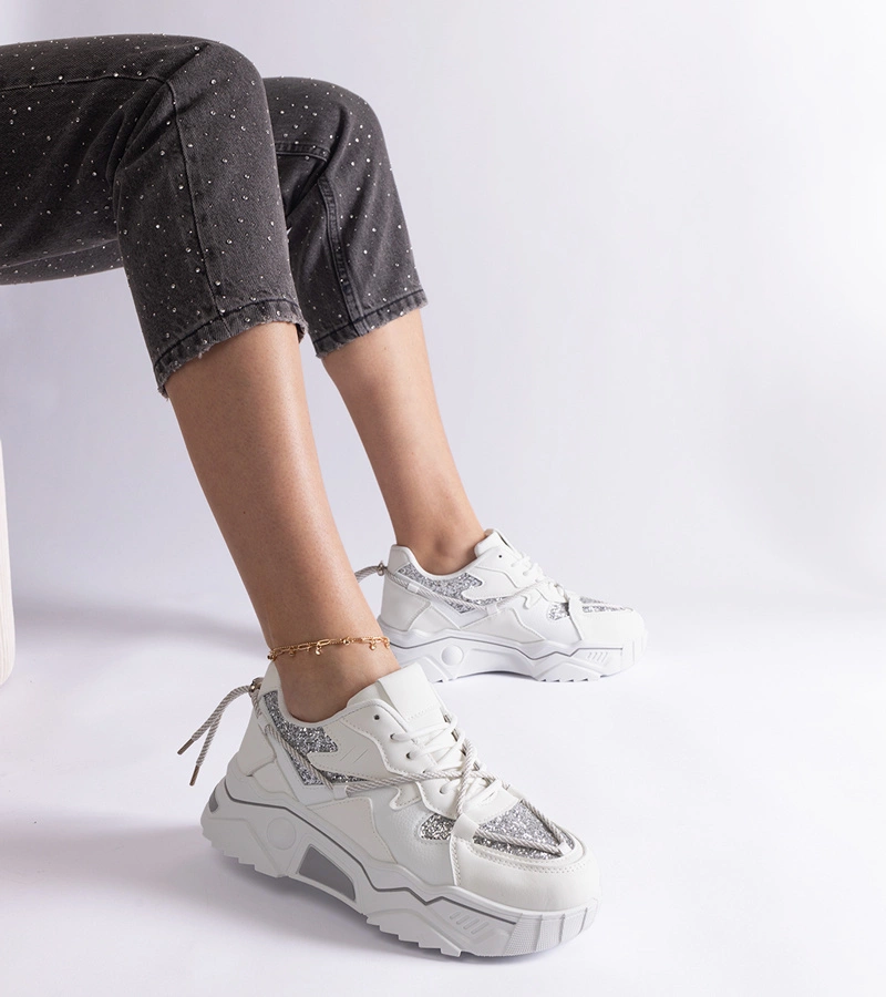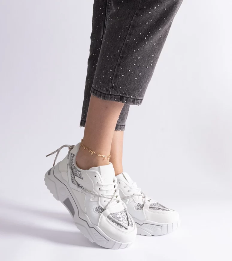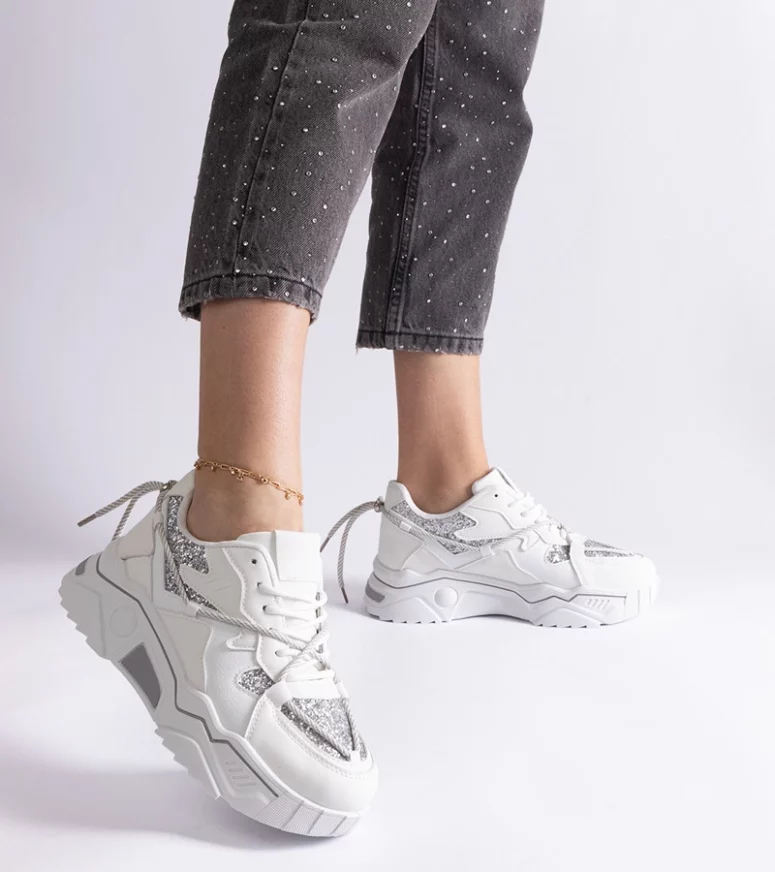 Nasze sneakersy z brokatem wyróżniają się nowoczesnym designem, który przyciąga uwagę i dodaje charakteru każdej stylizacji. Biały kolor butów jest uniwersalny i łatwo dopasowuje się do różnych zestawień, a błyszczący brokat dodaje im wyjątkowego uroku. To idealne obuwie dla kobiet, które chcą podkreślić swój styl i wyróżnić się z tłumu.