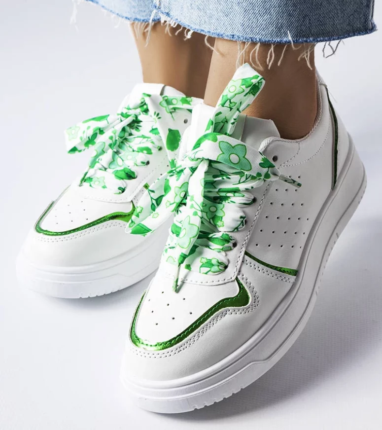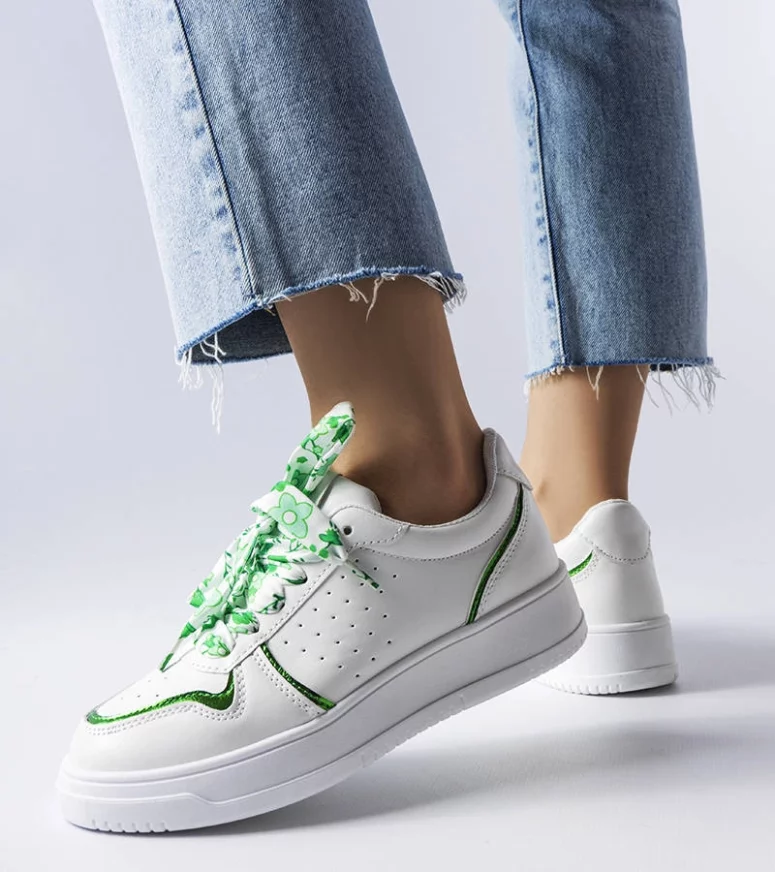 Białe sneakersy damskie dzięki grubej podeszwie dodadzą Ci centymetrów, a ich kolor sprawia, że są banalnie proste do wystylizowania. Cholewka wykonana z perforowanej skóry ekologicznej wzbogaconej kolorową lamówka oraz wiązane na wstążkę w dopasowanym kolorze. Bez problemu dopasujesz je do ulubionych jeansów, zwiewnej sukienki czy spódnicy typu maxi. Latem wyraźnie podkreślą Twoją opaleniznę. Noś je z przyjemnością! Numeracja standardowa, prosimy sugerować się swoim rozmiarem.