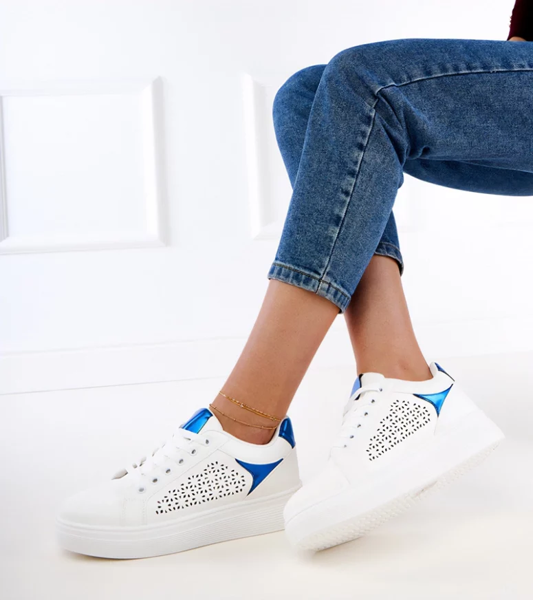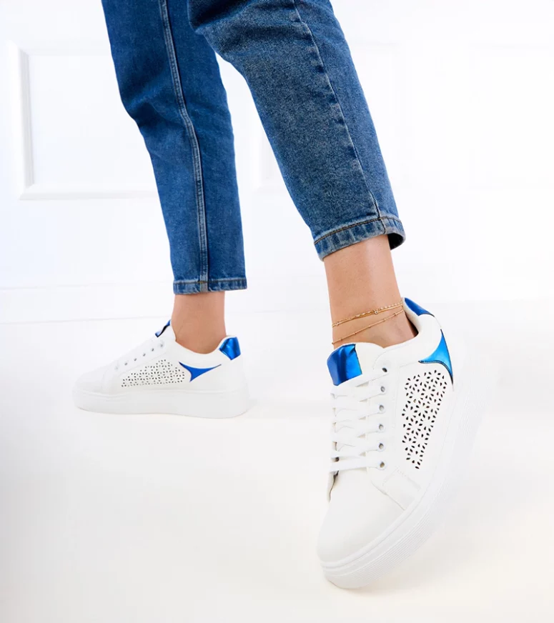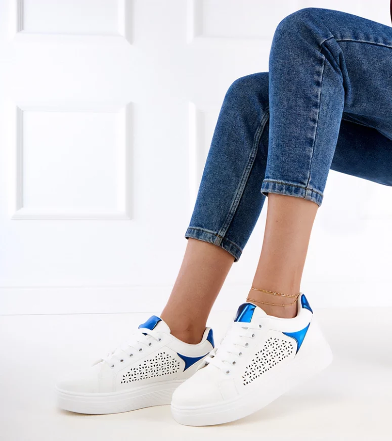 Wysokiej jakości wykonanie oraz dbałość o detale czynią z tych butów niezawodny element garderoby na wiele sezonów. Cholewka w klasycznym, białym kolorze została urozmaicona kontrastującymi, niebieskimi wstawkami, które nadają całości dynamicznego charakteru. Dzięki temu modne białe sneakersy na platformie przyciągają wzrok i podkreślają indywidualny styl użytkowniczki. To propozycja dla kobiet, które chcą połączyć aktualne trendy z praktycznością i wygodą.